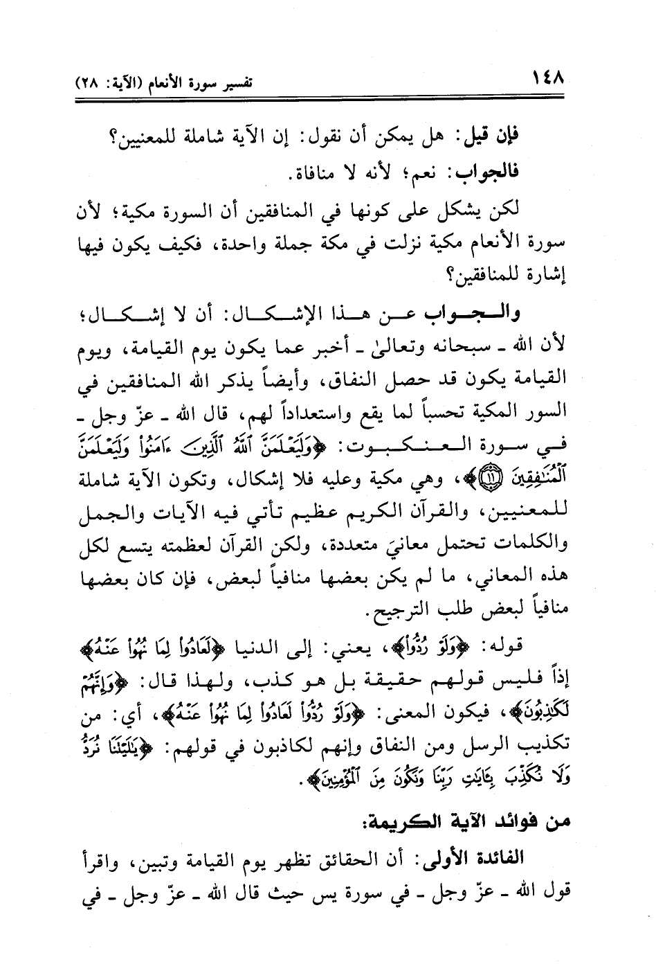 قوله: {وَلَوْ رُدُّوا}، يعني: إلى الدنيا {لَعَادُوا لِمَا نُهُوا عَنْهُ} إذًا فليس قولهم حقيقة بل هو كذب، ولهذا قال: {وَإِنَّهُمْ لَكَاذِبُونَ}، فيكون المعنى: {وَلَوْ رُدُّوا لَعَادُوا لِمَا نُهُوا عَنْهُ}، أي: من تكذيب الرسل ومن النفاق وإنهم لكاذبون في قولهم: {يَالَيْتَنَا نُرَدُّ وَلَا نُكَذِّبَ بِآيَاتِ رَبِّنَا وَنَكُونَ مِنَ الْمُؤْمِنِينَ}.