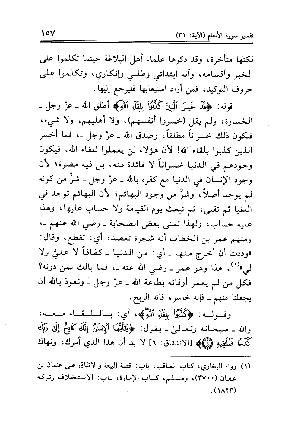 قوله: {قَدْ خَسِرَ الَّذِينَ كَذَّبُوا بِلِقَاءِ اللَّهِ} أطلق الله - عزّ وجل - الخسارة، ولم يقل (خسروا أنفسهم)، ولا أهليهم، ولا شيء، فيكون ذلك خسرانًا مطلقًا، وصدق الله - عزّ وجل -، فما أخسر الذين كذبوا بلقاء الله! لأن هؤلاء لن يعملوا للقاء الله، فيكون وجودهم في الدنيا خسرانًا لا فائدة منه، بل فيه مضرة؛ لأن وجود الإنسان في الدنيا مع كفره بالله - عزّ وجل - شرٌّ من كونه لم يوجد أصلًا، وشرٌّ من وجود البهائم؛ لأن البهائم توجد في الدنيا ثم تفنى، ثم تبعث يوم القيامة ولا حساب عليها، وهذا عليه حساب، ولهذا تمنى بعض الصحابة - رضي الله عنهم -، ومنهم عمر بن الخطاب أنه شجرة تعضد، أي: تقطع، وقال: "وددت أن أخرج منها - أي: من الدنيا - كفافًا لا عليَّ ولا لي " (¬١)، هذا وهو عمر - رضي الله عنه -، فما بالك بمن دونه؟ فكل من لم يعمر أوقاته بطاعة الله - عزّ وجل - ونعوذ بالله أن يجعلنا منهم - فإنه خاسر، فاته الربح.