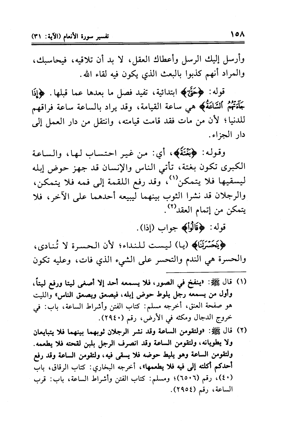 وقوله: {بَغْتَةً}، أي: من غير احتساب لها، والساعة الكبرى تكون بغتة، تأتي الناس والإنسان قد جهز حوض إبله ليسقيها فلا يتمكن (¬١)، وقد رفع اللقمة إلى فمه فلا يتمكن، والرجلان قد نشرا الثوب بينهما ليبيعه أحدهما على الآخر، فلا يتمكن من إتمام العقد (¬٢).