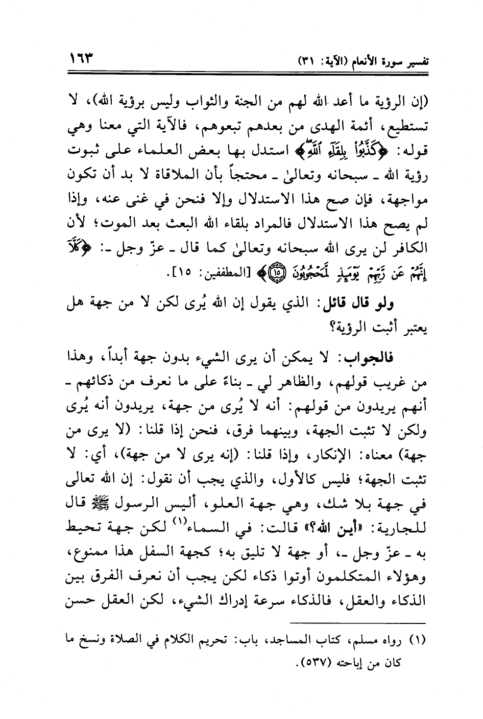 فالجواب: لا يمكن أن يرى الشيء بدون جهة أبدًا، وهذا من غريب قولهم، والظاهر لي - بناءً على ما نعرف من ذكائهم - أنهم يريدون من قولهم: أنه لا يُرى من جهة، يريدون أنه يُرى ولكن لا تثبت الجهة، وبينهما فرق، فنحن إذا قلنا: (لا يرى من جهة) معناه: الإنكار، وإذا قلنا: (إنه يرى لا من جهة)، أي: لا تثبت الجهة؛ فليس كالأول، والذي يجب أن نقول: إن الله تعالى في جهة بلا شك، وهي جهة العلو، أليس الرسول - صلى الله عليه وسلم - قال للجارية: "أين الله؟ " قالت: في السماء (¬١) لكن جهة تحيط به - عزّ وجل -، أو جهة لا تليق به؛ كجهة السفل هذا ممنوع، وهؤلاء المتكلمون أوتوا ذكاء لكن يجب أن نعرف الفرق بين الذكاء والعقل، فالذكاء سرعة إدراك الشيء، لكن العقل حسن