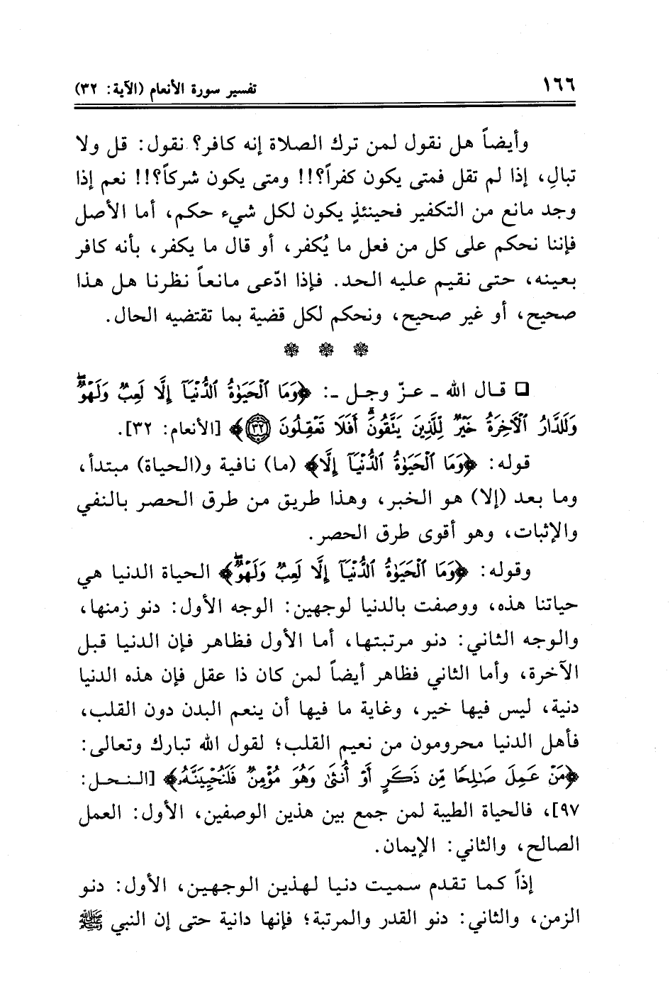 وقوله: {وَمَا الْحَيَاةُ الدُّنْيَا إِلَّا لَعِبٌ وَلَهْوٌ} الحياة الدنيا هي حياتنا هذه، ووصفت بالدنيا لوجهين: الوجه الأول: دنو زمنها، والوجه الثاني: دنو مرتبتها، أما الأول فظاهر فإن الدنيا قبل الآخرة، وأما الثاني فظاهر أيضًا لمن كان ذا عقل فإن هذه الدنيا دنية، ليس فيها خير، وغاية ما فيها أن ينعم البدن دون القلب، فأهل الدنيا محرومون من نعيم القلب؛ لقول الله تبارك وتعالى: {مَنْ عَمِلَ صَالِحًا مِنْ ذَكَرٍ أَوْ أُنْثَى وَهُوَ مُؤْمِنٌ فَلَنُحْيِيَنَّهُ} [النحل: ٩٧]، فالحياة الطيبة لمن جمع بين هذين الوصفين، الأول: العمل الصالح، والثاني: الإيمان.