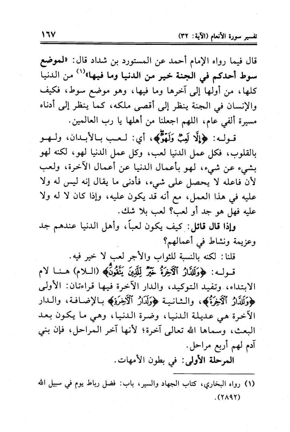 قلنا: لكنه بالنسبة للثواب والأجر لعب لا خير فيه. قوله: {وَلَلدَّارُ الْآخِرَةُ خَيْرٌ لِلَّذِينَ يَتَّقُونَ} (اللام) هنا لام الابتداء، وتفيد التوكيد، والدار الآخرة فيها قراءتان: الأولى {وَلَلدَّارُ الْآخِرَةُ}، والثانية {وَلَلدَّارُ الْآخِرَةُ} بالإضافة، والدار الآخرة هي عديلة الدنيا، وضرة الدنيا، وهي ما يكون بعد البعث، وسماها الله تعالى آخرة؛ لأنها آخر المراحل، فإن بني آدم لهم أربع مراحل.