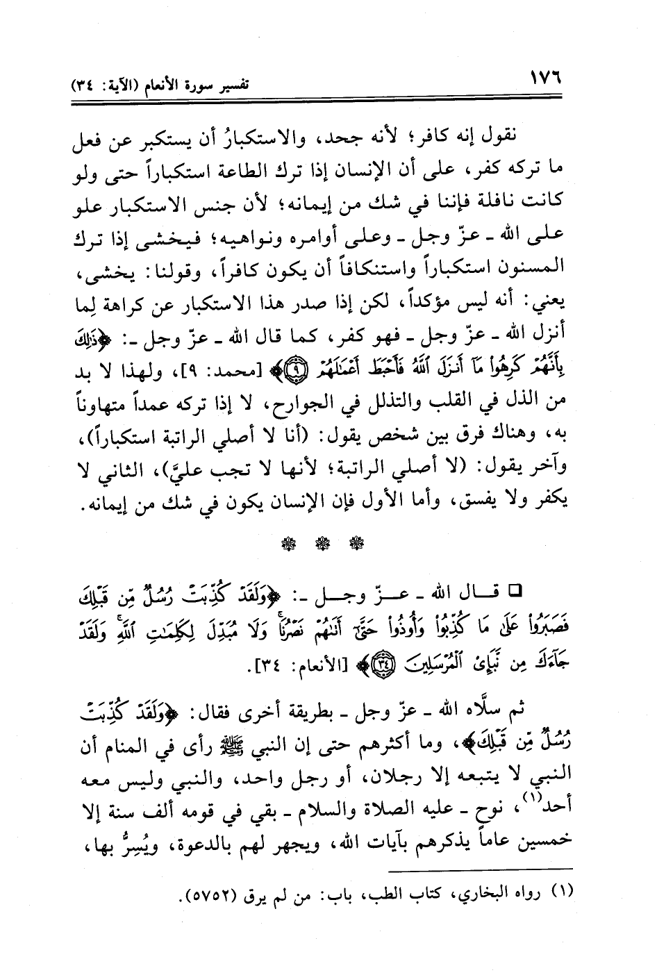نقول إنه كافر؛ لأنه جحد، والاستكبارُ أن يستكبر عن فعل ما تركه كفر، على أن الإنسان إذا ترك الطاعة استكبارًا حتى ولو كانت نافلة فإننا في شك من إيمانه؛ لأن جنس الاستكبار علو على الله - عزّ وجل - وعلى أوامره ونواهيه؛ فيخشى إذا ترك المسنون استكبارًا واستنكافًا أن يكون كافرًا، وقولنا: يخشى، يعني: أنه ليس مؤكدًا، لكن إذا صدر هذا الاستكبار عن كراهة لِما أنزل الله - عزّ وجل - فهو كفر، كما قال الله - عزّ وجل -: {ذَلِكَ بِأَنَّهُمْ كَرِهُوا مَا أَنْزَلَ اللَّهُ فَأَحْبَطَ أَعْمَالَهُمْ (٩)} [محمد: ٩]، ولهذا لا بد من الذل في القلب والتذلل في الجوارح، لا إذا تركه عمدًا متهاونًا به، وهناك فرق بين شخص يقول: (أنا لا أصلي الراتبة استكبارًا)، وآخر يقول: (لا أصلي الراتبة؛ لأنها لا تجب عليَّ)، الثاني لا يكفر ولا يفسق، وأما الأول فإن الإنسان يكون في شك من إيمانه.