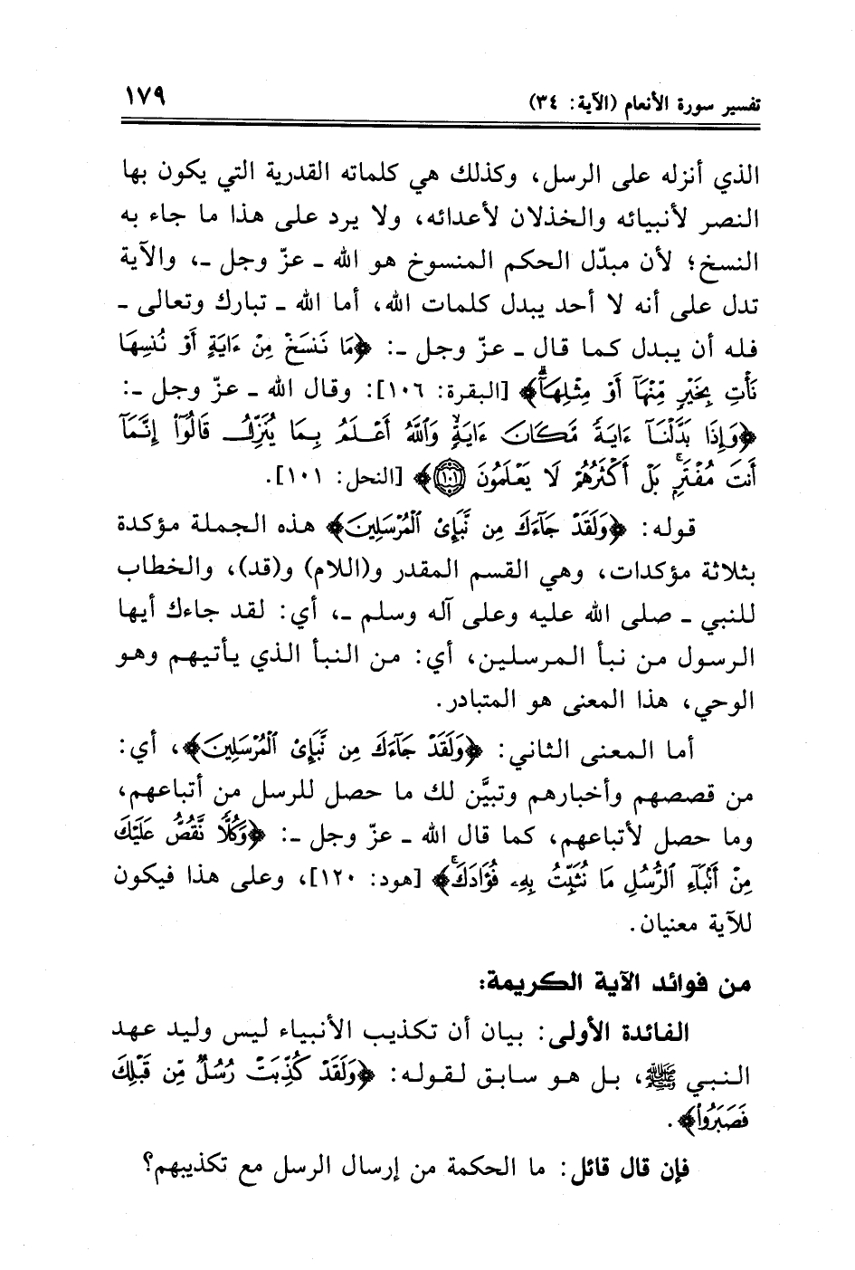 الذي أنزله على الرسل، وكذلك هي كلماته القدرية التي يكون بها النصر لأنبيائه والخذلان لأعدائه، ولا يرد على هذا ما جاء به النسخ؛ لأن مبدّل الحكم المنسوخ هو الله - عزّ وجل -، والآية تدل على أنه لا أحد يبدل كلمات الله، أما الله - تبارك وتعالى - فله أن يبدل كما قال - عزّ وجل -: {مَا نَنْسَخْ مِنْ آيَةٍ أَوْ نُنْسِهَا نَأْتِ بِخَيْرٍ مِنْهَا أَوْ مِثْلِهَا} [البقرة: ١٠٦]: وقال الله - عزّ وجل -: {وَإِذَا بَدَّلْنَا آيَةً مَكَانَ آيَةٍ وَاللَّهُ أَعْلَمُ بِمَا يُنَزِّلُ قَالُوا إِنَّمَا أَنْتَ مُفْتَرٍ بَلْ أَكْثَرُهُمْ لَا يَعْلَمُونَ (١٠١)} [النحل: ١٠١].