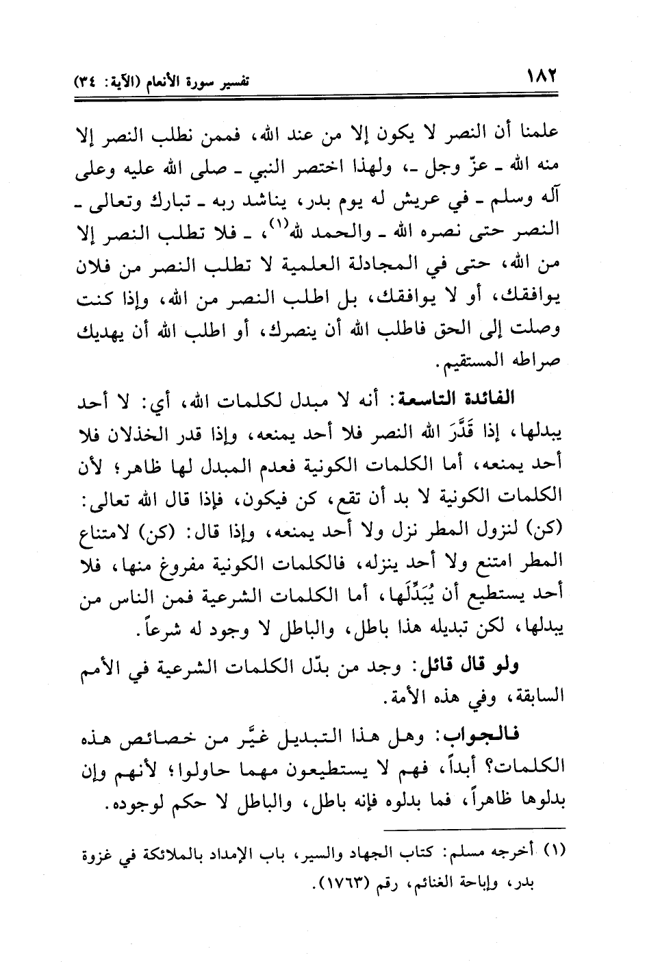 الفائدة التاسعة: أنه لا مبدل لكلمات الله، أي: لا أحد يبدلها، إذا قَدَّرَ الله النصر فلا أحد يمنعه، وإذا قدر الخذلان فلا أحد يمنعه، أما الكلمات الكونية فعدم المبدل لها ظاهر؛ لأن الكلمات الكونية لا بد أن تقع، كن فيكون، فإذا قال الله تعالى: (كن) لنزول المطر نزل ولا أحد يمنعه، وإذا قال: (كن) لامتناع المطر امتنع ولا أحد ينزله، فالكلمات الكونية مفروغ منها، فلا أحد يستطيع أن يُبَدِّلَها، أما الكلمات الشرعية فمن الناس من يبدلها، لكن تبديله هذا باطل، والباطل لا وجود له شرعًا.