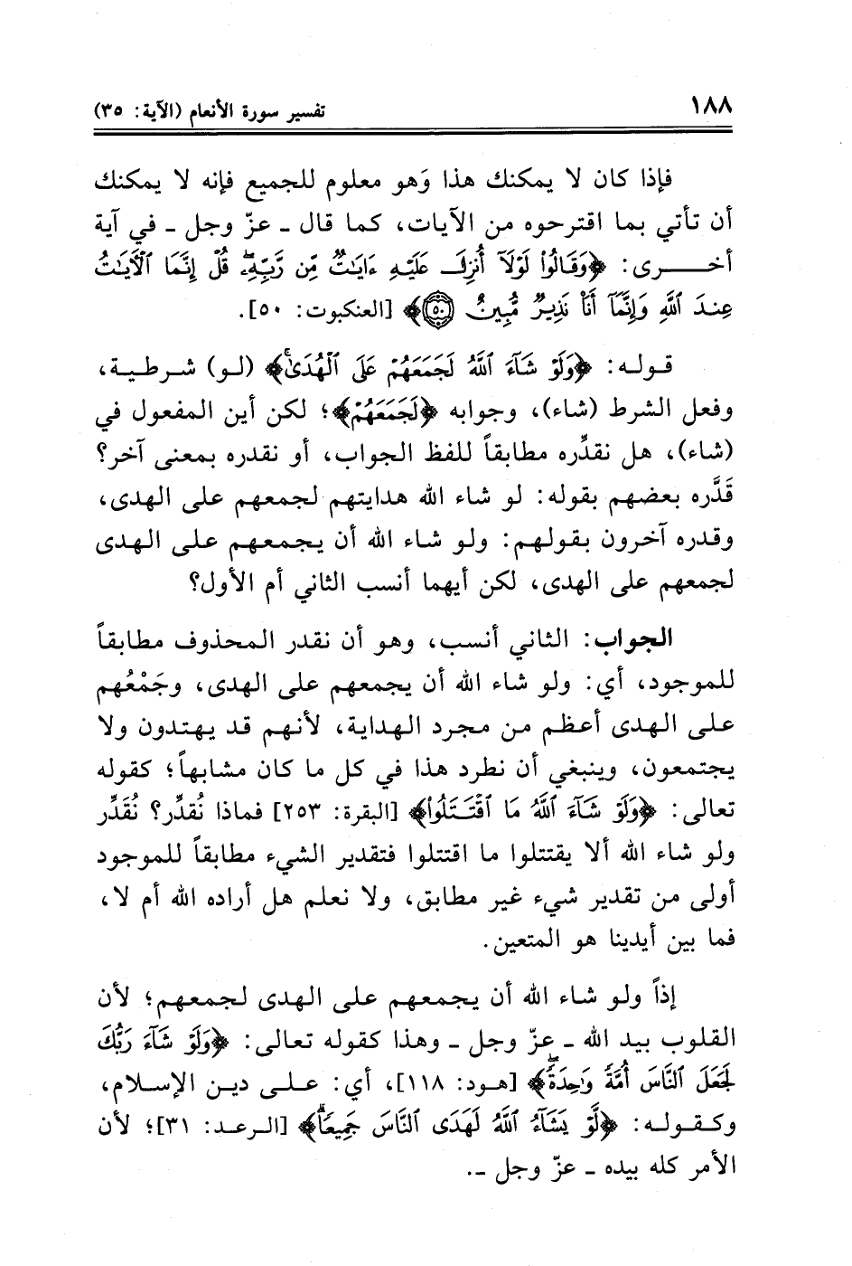 قوله: {وَلَوْ شَاءَ اللَّهُ لَجَمَعَهُمْ عَلَى الْهُدَى} (لو) شرطية، وفعل الشرط (شاء)، وجوابه {لَجَمَعَهُمْ}، لكن أين المفعول في (شاء)، هل نقدِّره مطابقًا للفظ الجواب، أو نقدره بمعنى آخر؟ قَدَّره بعضهم بقوله: لو شاء الله هدايتهم لجمعهم على الهدى، وقدره آخرون بقولهم: ولو شاء الله أن يجمعهم على الهدى لجمعهم على الهدى، لكن أيهما أنسب الثاني أم الأول؟