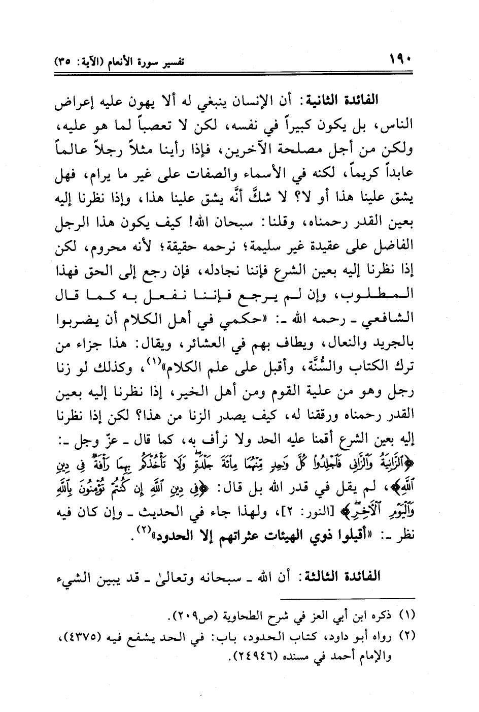 الفائدة الثانية: أن الإنسان ينبغي له ألا يهون عليه إعراض الناس، بل يكون كبيرًا في نفسه، لكن لا تعصبًا لما هو عليه، ولكن من أجل مصلحة الآخرين، فإذا رأينا مثلًا رجلًا عالمًا عابدًا كريمًا، لكنه في الأسماء والصفات على غير ما يرام، فهل يشق علينا هذا أو لا؟ لا شكَّ أنَّه يشق علينا هذا، وإذا نظرنا إليه بعين القدر رحمناه، وقلنا: سبحان الله! كيف يكون هذا الرجل الففيضل على عقيدة غير سليمة؛ نرحمه حقيقة؛ لأنه محروم، لكن إذا نظرنا إليه بعين الشرع فإننا نجادله، فإن رجع إلى الحق فهذا المطلوب، وإن لم يرجع فإننا نفعل به كما قال الشافعي - رحمه الله -: "حكمي في أهل الكلام أن يضربوا بالجريد والنعال، ويطاف بهم في العشائر، ويقال: هذا جزاء من ترك الكتاب والسُّنَّة، وأقبل على علم الكلام" (¬١)، وكذلك لو زنا رجل وهو من علية القوم ومن أهل الخير، إذا نظرنا إليه بعين القدر رحمناه ورققنا له، كيف يصدر الزنا من هذا؟ لكن إذا نظرنا إليه بعين الشرع أقمنا عليه الحد ولا نرأف به، كما قال - عزّ وجل -: {الزَّانِيَةُ وَالزَّانِي فَاجْلِدُوا كُلَّ وَاحِدٍ مِنْهُمَا مِائَةَ جَلْدَةٍ وَلَا تَأْخُذْكُمْ بِهِمَا رَأْفَةٌ فِي دِينِ اللَّهِ}، لم يقل في قدر الله بل قال: {فِي دِينِ اللَّهِ إِنْ كُنْتُمْ تُؤْمِنُونَ بِاللَّهِ وَالْيَوْمِ الْآخِرِ} [النور: ٢]، ولهذا جاء في الحديث - وإن كان فيه نظر -: "أقيلوا ذوي الهيئات عثراتهم إلا الحدود" (¬٢).