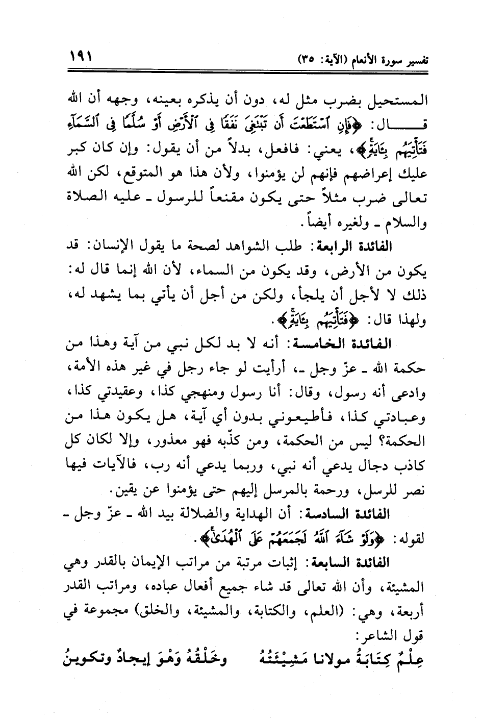 الفائدة السابعة: إثبات مرتبة من مراتب الإيمان بالقدر وهي المشيئة، وأن الله تعالى قد شاء جميع أفعال عباده، ومراتب القدر أربعة، وهي: (العلم، والكتابة، والمشيئة، والخلق) مجموعة في قول الشاعر: