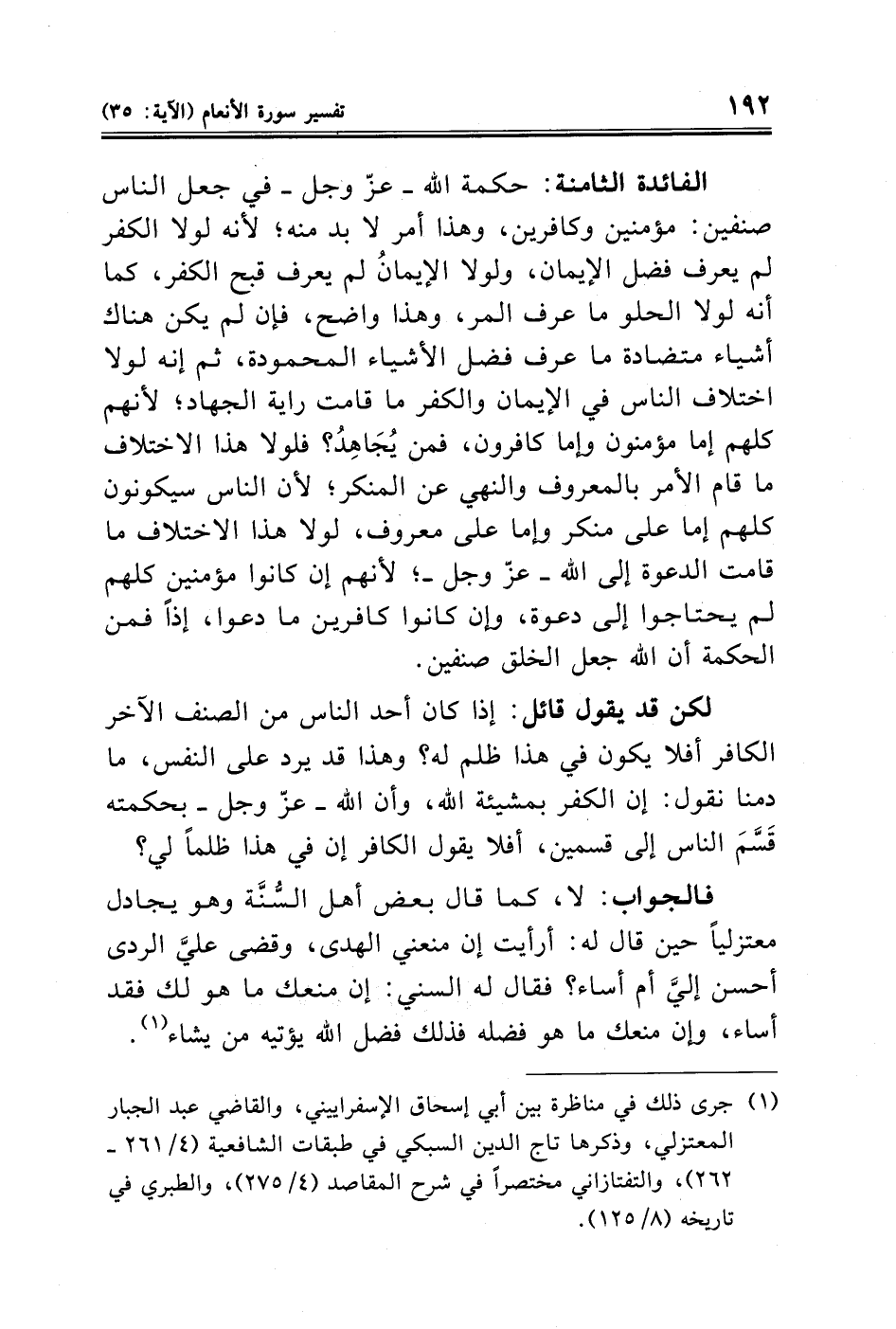 لكن قد يقول قائل: إذا كان أحد الناس من الصنف الآخر الكافر أفلا يكون في هذا ظلم له؟ وهذا قد يرد على النفس، ما دمنا نقول: إن الكفر بمشيئة الله، وأن الله - عزّ وجل - بحكمته قَسَّمَ الناس إلى قسمين، أفلا يقول الكافر إن في هذا ظلمًا لي؟