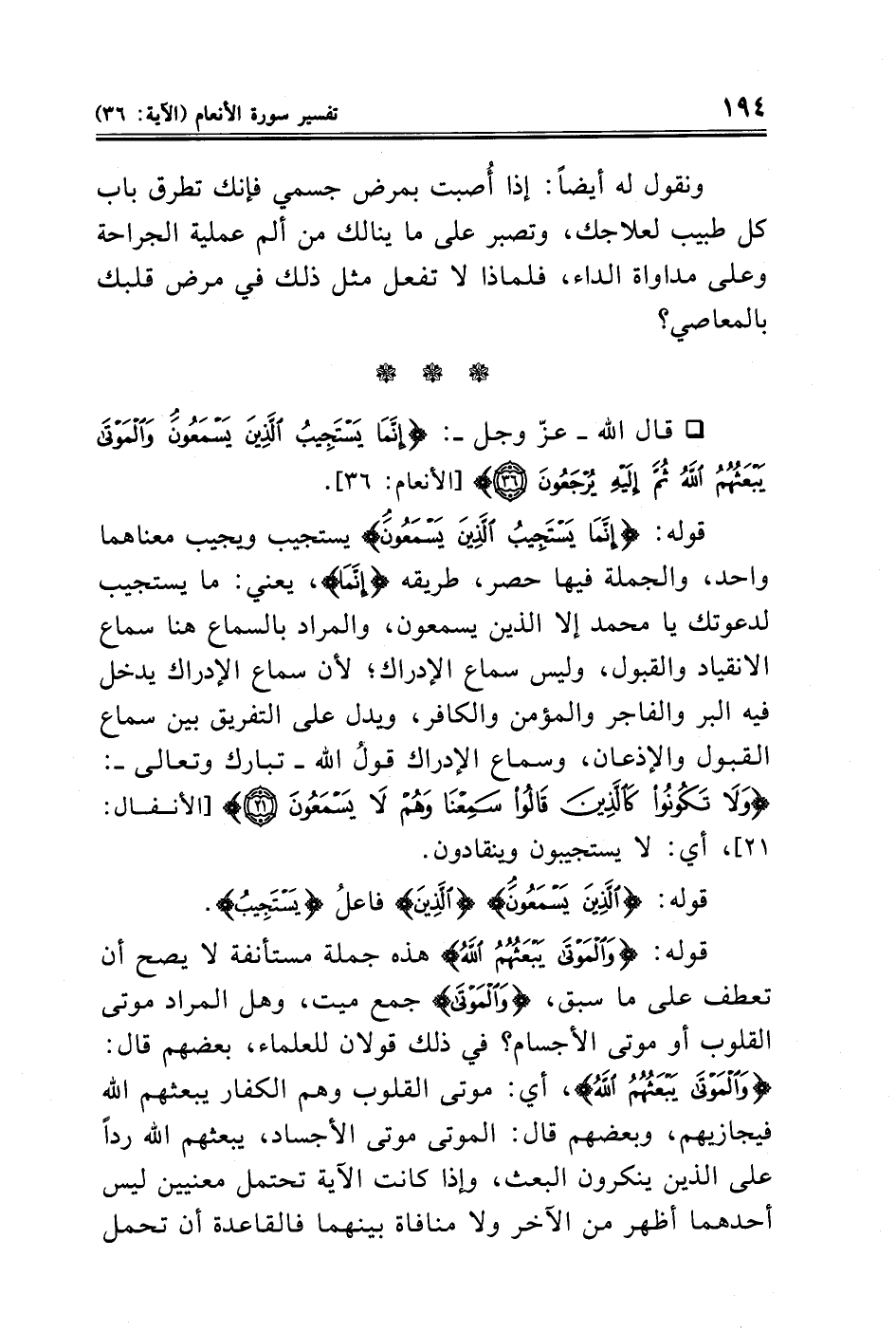 * قال الله - عزّ وجل -: {إِنَّمَا يَسْتَجِيبُ الَّذِينَ يَسْمَعُونَ وَالْمَوْتَى يَبْعَثُهُمُ اللَّهُ ثُمَّ إِلَيْهِ يُرْجَعُونَ (٣٦)} [الأنعام: ٣٦].