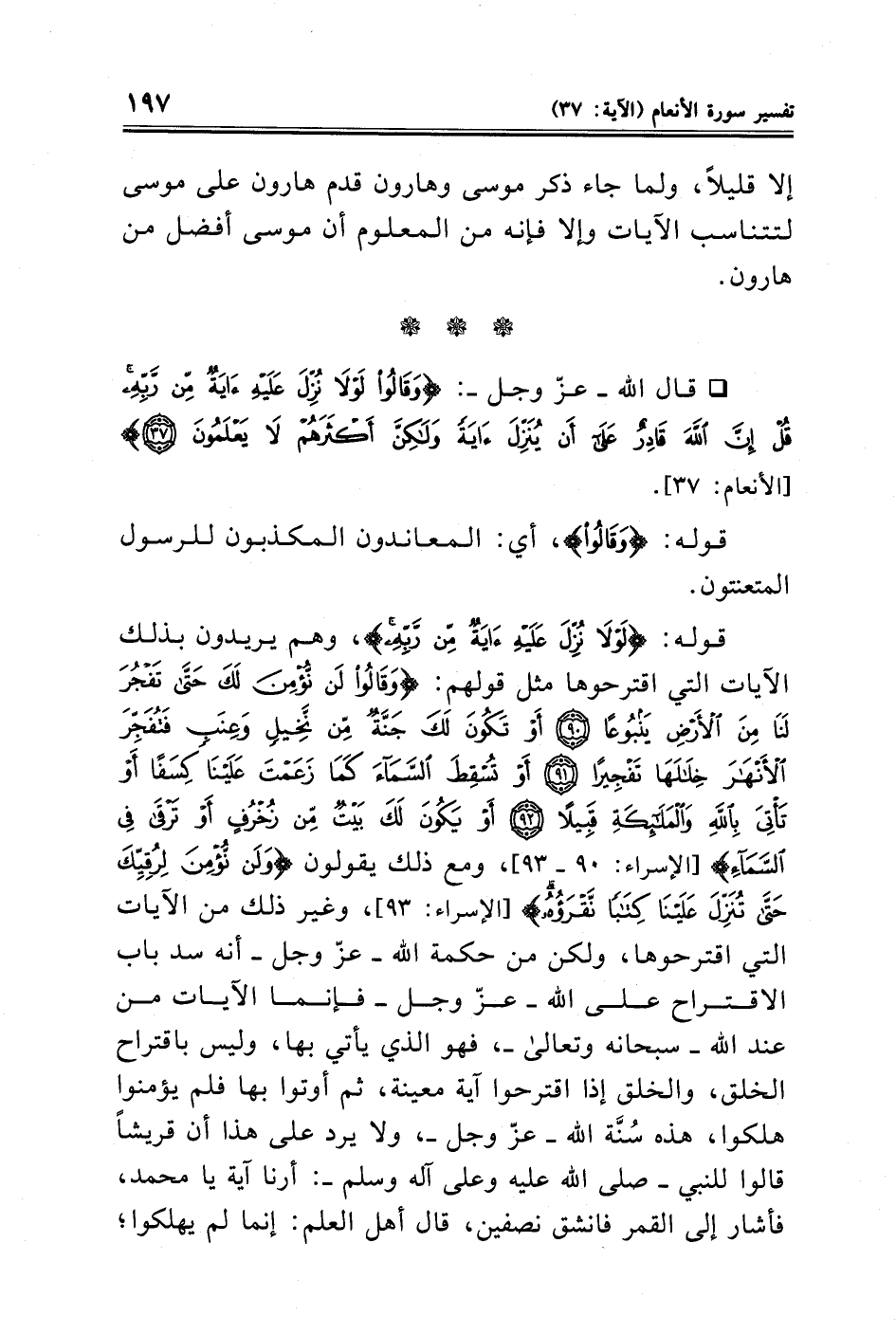 * قال الله - عزّ وجل -: {وَقَالُوا لَوْلَا نُزِّلَ عَلَيْهِ آيَةٌ مِنْ رَبِّهِ قُلْ إِنَّ اللَّهَ قَادِرٌ عَلَى أَنْ يُنَزِّلَ آيَةً وَلَكِنَّ أَكْثَرَهُمْ لَا يَعْلَمُونَ (٣٧)} [الأنعام: ٣٧].
