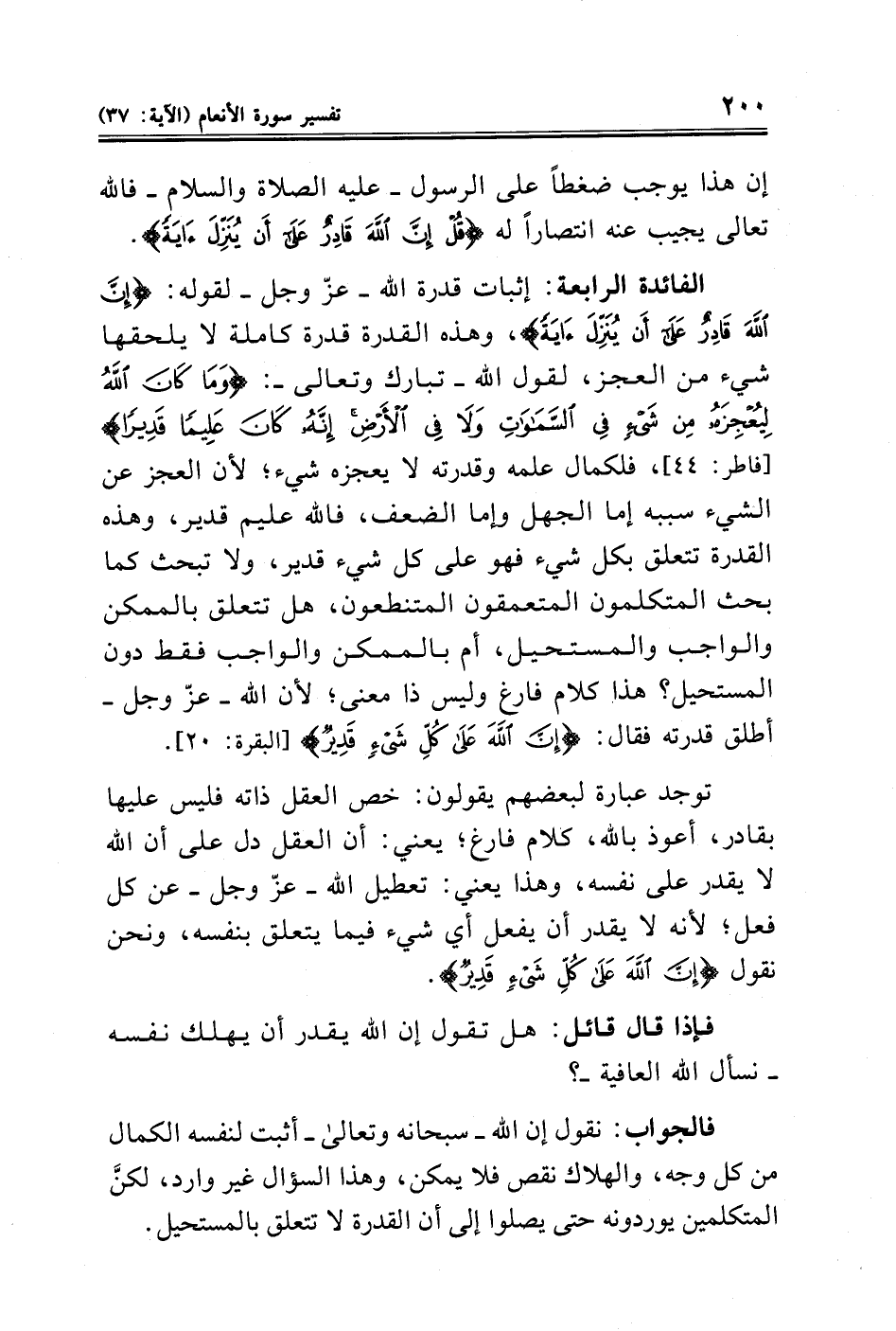 الفائدة الرابعة: إثبات قدرة الله - عزّ وجل - لقوله: {إِنَّ اللَّهَ قَادِرٌ عَلَى أَنْ يُنَزِّلَ آيَةً}، وهذه القدرة قدرة كاملة لا يلحقها شيء من العجز، لقول الله - تبارك وتعالى -: {وَمَا كَانَ اللَّهُ لِيُعْجِزَهُ مِنْ شَيْءٍ فِي السَّمَاوَاتِ وَلَا فِي الْأَرْضِ إِنَّهُ كَانَ عَلِيمًا قَدِيرًا} [فاطر: ٤٤]، فلكمال علمه وقدرته لا يعجزه شيء؛ لأن العجز عن الشيء سببه إما الجهل وإما الضعف، فالله عليم قدير، وهذه القدرة تتعلق بكل شيء فهو على كل شيء قدير، ولا تبحث كما جث المتكلمون المتعمقون المتنطعون، هل تتعلق بالممكن والواجب والمستحيل، أم بالممكن والواجب فقط دون المستحيل؟ هذا. كلام فارغ وليس ذا معنى؛ لأن الله - عزّ وجل - أطلق قدرته فقال: {إِنَّ اللَّهَ عَلَى كُلِّ شَيْءٍ قَدِيرٌ} [البقرة: ٢٠].