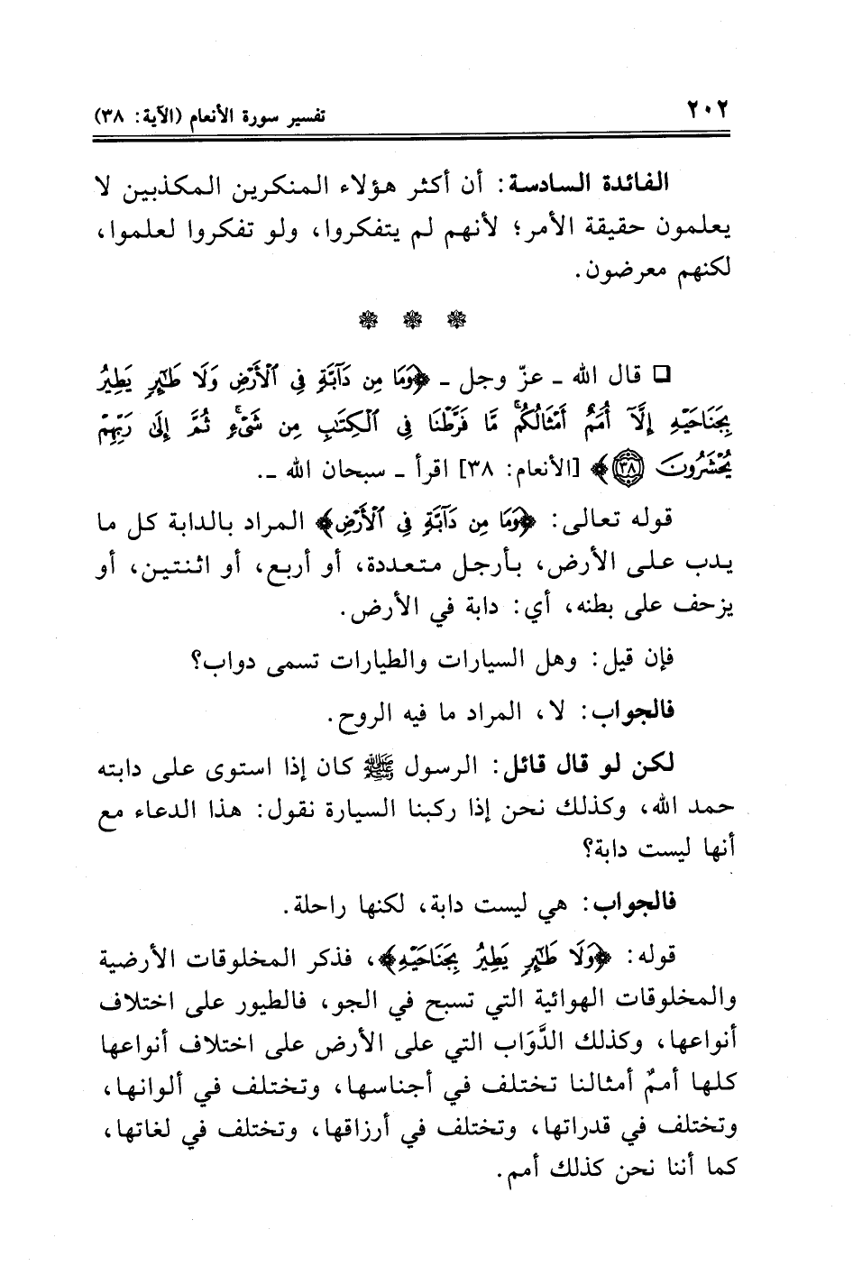 * قال الله - عزّ وجل - {وَمَا مِنْ دَابَّةٍ فِي الْأَرْضِ وَلَا طَائِرٍ يَطِيرُ بِجَنَاحَيْهِ إِلَّا أُمَمٌ أَمْثَالُكُمْ مَا فَرَّطْنَا فِي الْكِتَابِ مِنْ شَيْءٍ ثُمَّ إِلَى رَبِّهِمْ يُحْشَرُونَ (٣٨)} [الأنعام: ٣٨] اقرأ - سبحان الله -.