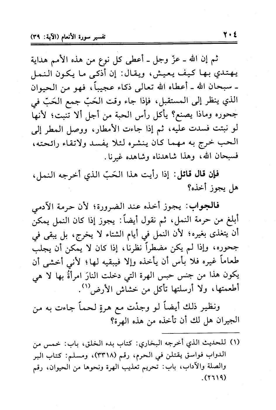 فالجواب: يجوز أخذه عند الضرورة؛ لأن حرمة الآدمي أبلغ من حرمة النمل، ثم نقول أيضاً: يجوز إذا كان النمل يمكن أن يتغذى بغيره؛ لأن النمل في أيام الشتاء لا يخرج، بل يبقى في جحوره، وإذا لم يكن مضطراً نظرنا، إذا كان لا يمكن أن يجلب طعاماً غيره فلا بأس أن يأخذه وإلا فيبقيه لها؛ لأني أخشى أن يكون هذا من جنس حبس الهرة التي دخلت النارَ امرأةُ بها لا هي أطعمتها، ولا أرسلتها تأكل من خشاش الأرض (¬١).