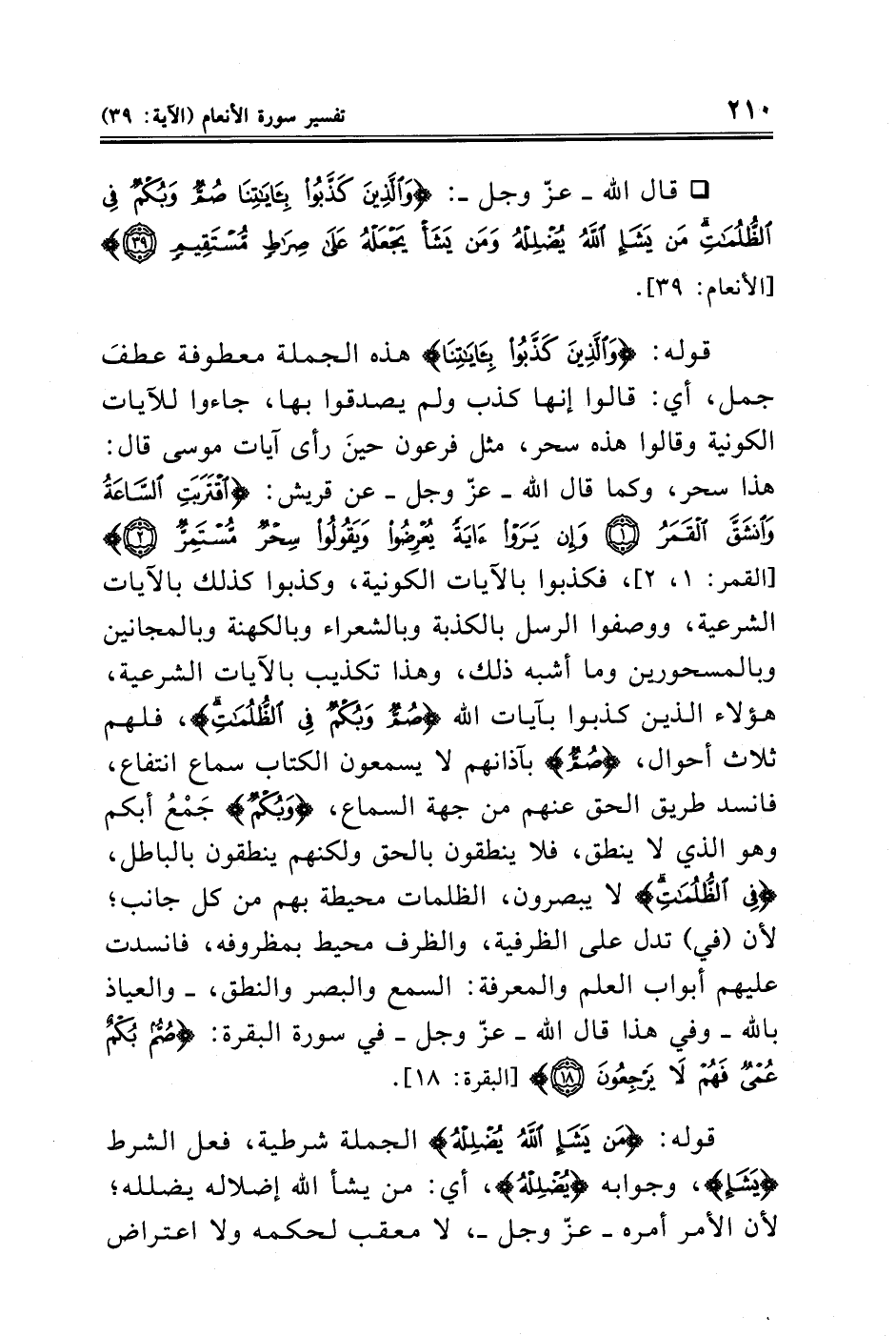 * قال الله - عزّ وجل -: {وَالَّذِينَ كَذَّبُوا بِآيَاتِنَا صُمٌّ وَبُكْمٌ فِي الظُّلُمَاتِ مَنْ يَشَإِ اللَّهُ يُضْلِلْهُ وَمَنْ يَشَأْ يَجْعَلْهُ عَلَى صِرَاطٍ مُسْتَقِيمٍ (٣٩)} [الأنعام: ٣٩].