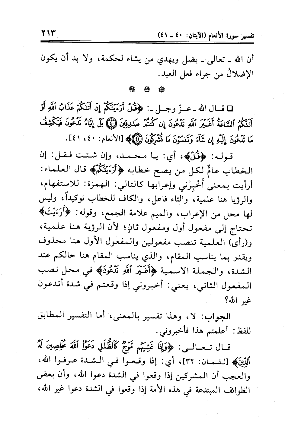 * قال الله - عزّ وجل -: {قُلْ أَرَأَيْتَكُمْ إِنْ أَتَاكُمْ عَذَابُ اللَّهِ أَوْ أَتَتْكُمُ السَّاعَةُ أَغَيْرَ اللَّهِ تَدْعُونَ إِنْ كُنْتُمْ صَادِقِينَ (٤٠) بَلْ إِيَّاهُ تَدْعُونَ فَيَكْشِفُ مَا تَدْعُونَ إِلَيْهِ إِنْ شَاءَ وَتَنْسَوْنَ مَا تُشْرِكُونَ (٤١)} [الأنعام: ٤٠ - ٤١].