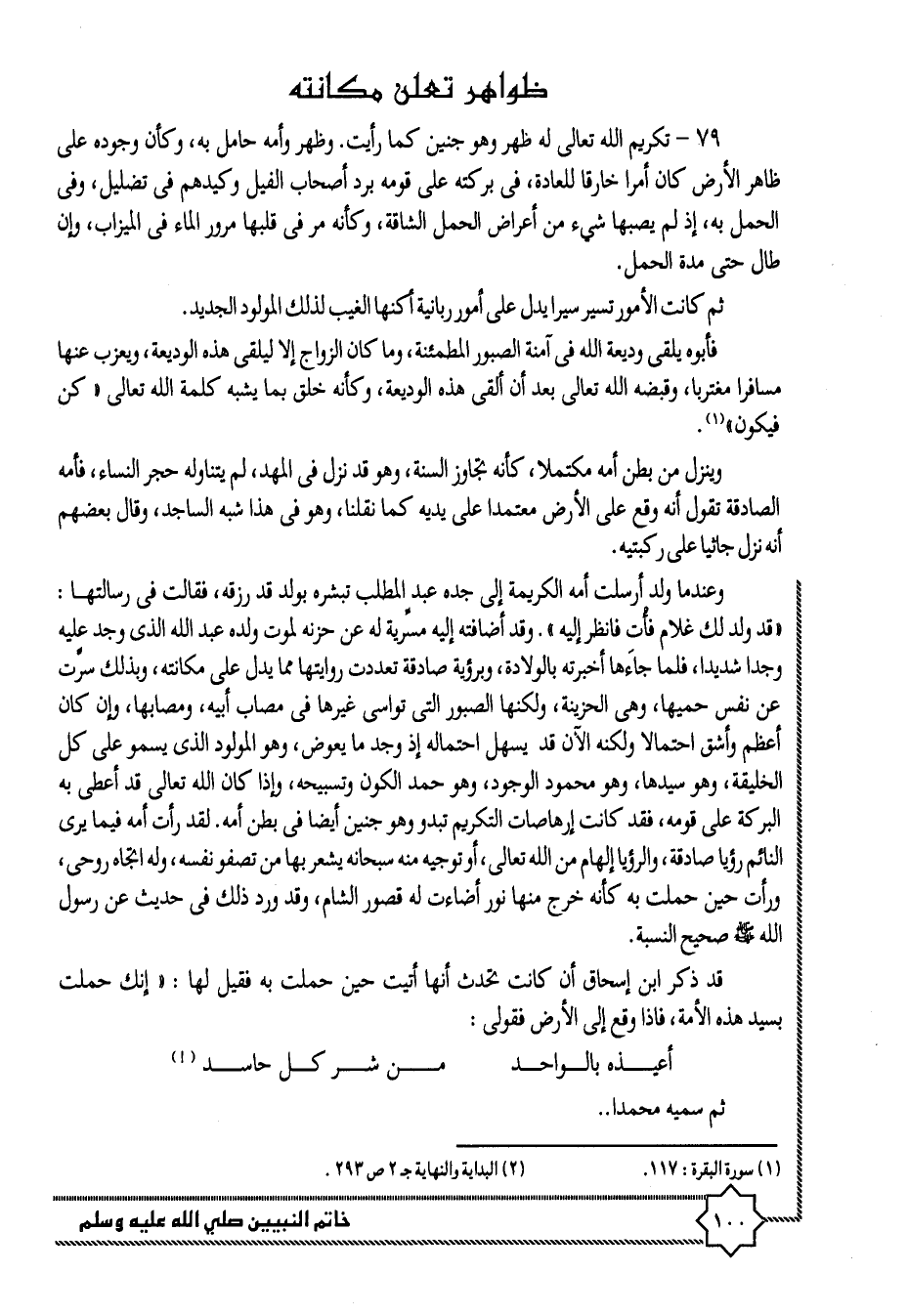 79- تكريم الله تعالى له ظهر وهو جنين كما رأيت. وظهر وأمه حامل به، وكأن وجوده على ظاهر الأرض كان أمرا خارقا للعادة، فى بركته على قومه برد أصحاب الفيل وكيدهم فى تضليل، وفى الحمل به، إذ لم يصبها شيء من أعراض الحمل الشاقة، وكأنه مر فى قلبها مرور الماء فى الميزاب، وإن طال حتى مدة الحمل.