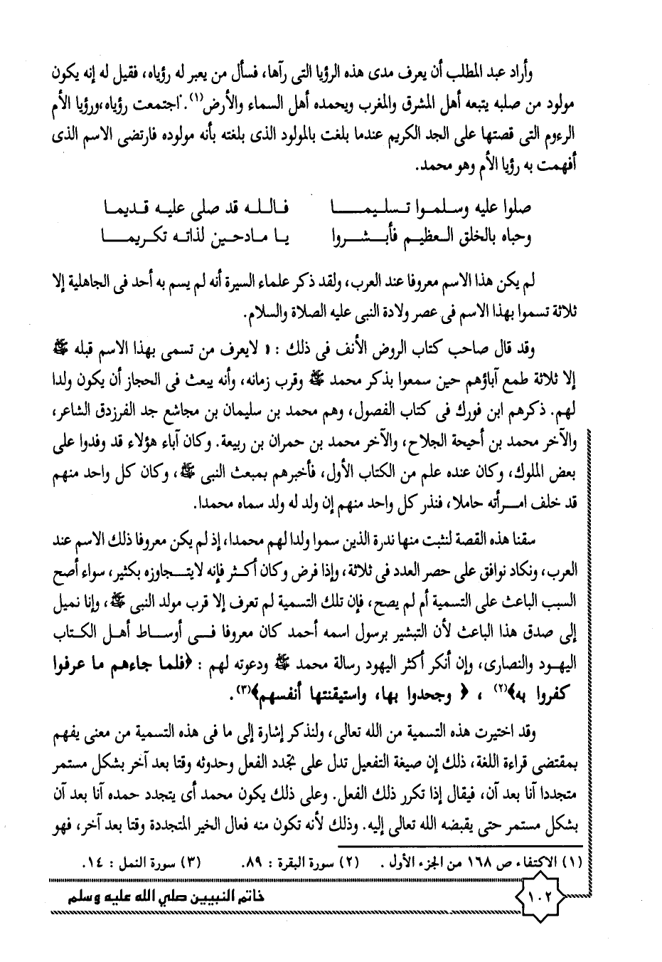 سقنا هذه القصة لنثبت منها ندرة الذين سموا ولدا لهم محمدا، إذ لم يكن معروفا ذلك الاسم عند العرب، ونكاد نوافق على حصر العدد فى ثلاثة، وإذا فرض وكان أكثر فإنه لا يتجاوزه بكثير، سواء أصح السبب الباعث على التسمية أم لم يصح، فإن تلك التسمية لم تعرف إلا قرب مولد النبى صلّى الله عليه وسلّم، وإنا نميل إلى صدق هذا الباعث لأن التبشير برسول اسمه أحمد كان معروفا فى أوساط أهل الكتاب اليهود والنصارى، وإن أنكر أكثر اليهود رسالة محمد صلّى الله عليه وسلّم ودعوته لهم: فَلَمَّا جاءَهُمْ ما عَرَفُوا كَفَرُوا بِهِ «2» ، وَجَحَدُوا بِها، وَاسْتَيْقَنَتْها أَنْفُسُهُمْ «3» .