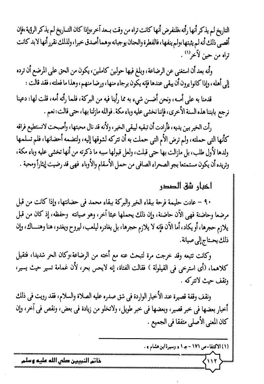 ونقف وقفة قصيرة عند الأخبار الواردة فى شق صدره عليه الصلاة والسلام، فقد رويت فى ذلك أخبار بعضها فى خبر قصير، وبعضها فى خبر طويل، ولا تخلو من زيادة فى بعض، ونقص فى اخر، وإن كان المعنى الأصلى متفقا فى الجميع.
