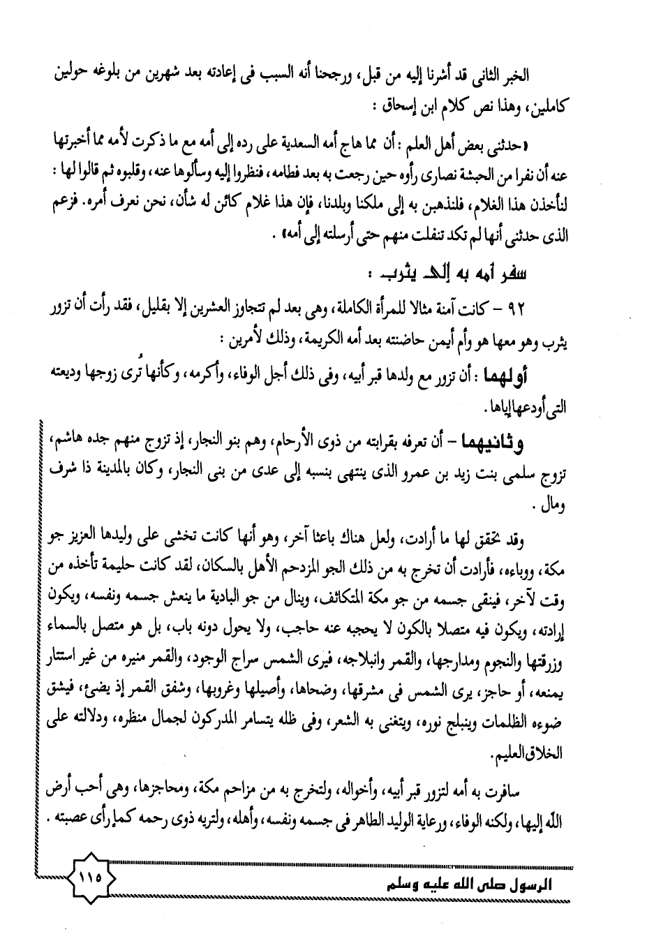 92- كانت امنة مثالا للمرأة الكاملة، وهى بعد لم تتجاوز العشرين إلا بقليل، فقد رأت أن تزور يثرب وهو معها هو وأم أيمن حاضنته بعد أمه الكريمة، وذلك لأمرين: