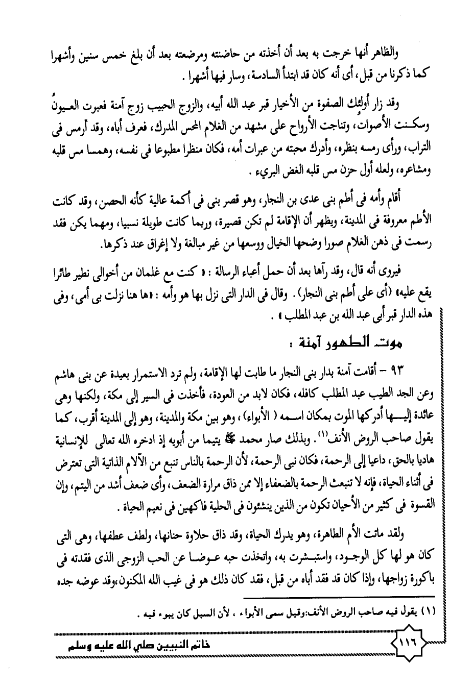 ولقد ماتت الأم الطاهرة، وهو يدرك الحياة، وقد ذاق حلاوة حنانها، ولطف عطفها، وهى التى كان هو لها كل الوجود، واستبشرت به، واتخذت حبه عوضا عن الحب الزوجى الذى فقدته فى باكورة زواجها، وإذا كان قد فقد أباه من قبل، فقد كان ذلك هو فى غيب الله المكنون، وقد عوضه جده