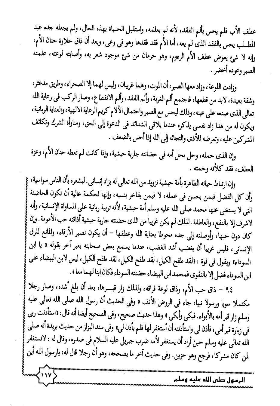94- ذاق حب الأم، وذاق لوعة فراقه، ولذلك زار قبرها، بعد أن بلغ أشده، وصار رجلا مكتملا سويا ورسولا نبيا، جاء فى الروض الأنف «وفى الحديث أن رسول الله صلى الله تعالى عليه وسلم زار قبر أمه بالأبواء. فبكى وأبكى» وهذا حديث صحيح، وفى الصحيح أيضا أنه قال: «استأذنت ربى فى زيارة قبر أمى، فأذن لى واستأذنته أن أستغفر لها فلم يأذن لى» وفى سند البزاز من حديث بريدة أنه صلى الله تعالى عليه وسلم حين أراد أن يستغفر لأمه ضرب جبريل عليه السلام فى صدره، وقال له: لا تستغفر لمن كان مشركا، فرجع وهو حزين. وفى حديث اخر ما يصححه، وهو أن رجلا قال له: يا رسول الله أين