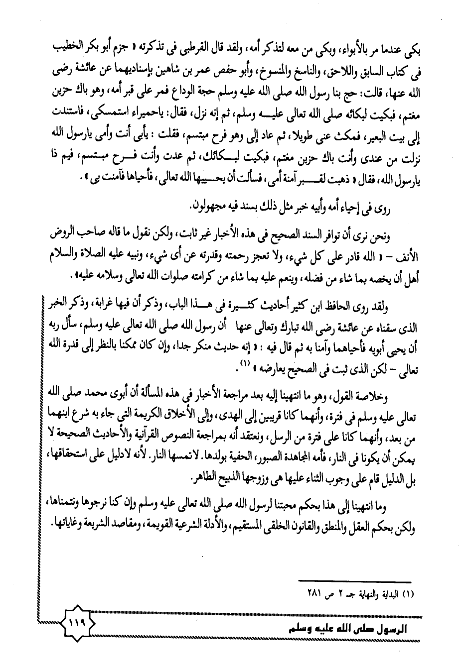 ولقد روى الحافظ ابن كثير أحاديث كثيرة فى هذا الباب، وذكر أن فيها غرابة، وذكر الخبر الذى سقناه عن عائشة رضى الله تبارك وتعالى عنها أن رسول الله صلى الله تعالى عليه وسلم، سأل ربه أن يحيى أبويه فأحياهما وامنا به ثم قال فيه: «إنه حديث منكر جدا، وإن كان ممكنا بالنظر إلى قدرة الله تعالى- لكن الذى ثبت فى الصحيح يعارضه» «1» .
