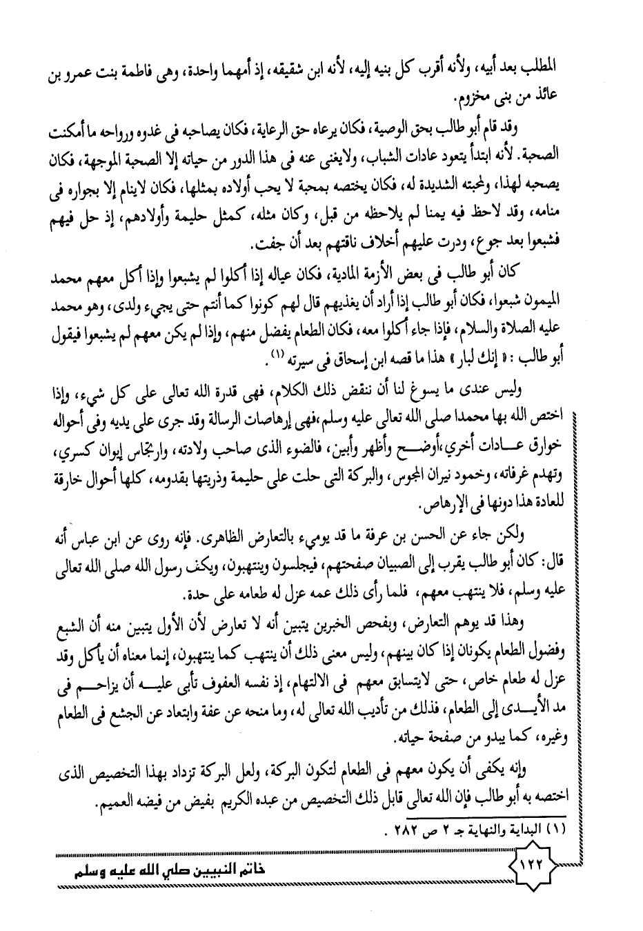 وإنه يكفى أن يكون معهم فى الطعام لتكون البركة، ولعل البركة تزداد بهذا التخصيص الذى اختصه به أبو طالب فإن الله تعالى قابل ذلك التخصيص من عبده الكريم بفيض من فيضه العميم.