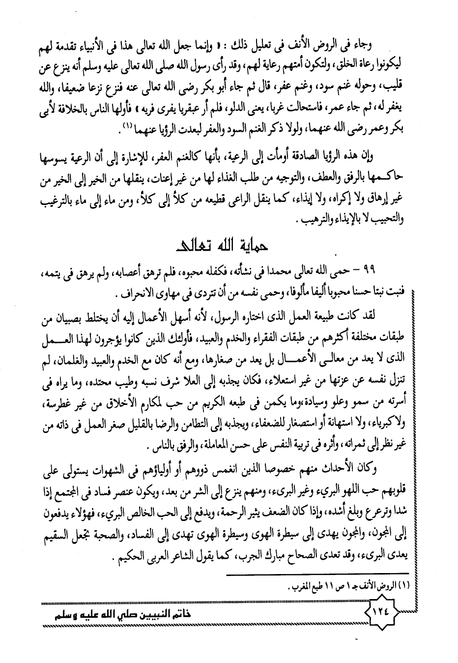 99- حمى الله تعالى محمدا فى نشأته، فكفله محبوه، فلم ترهق أعصابه، ولم يرهق فى يتمه، فنبت نبتا حسنا محبوبا أليفا مألوفا، وحمى نفسه من أن تتردى فى مهاوى الانحراف.