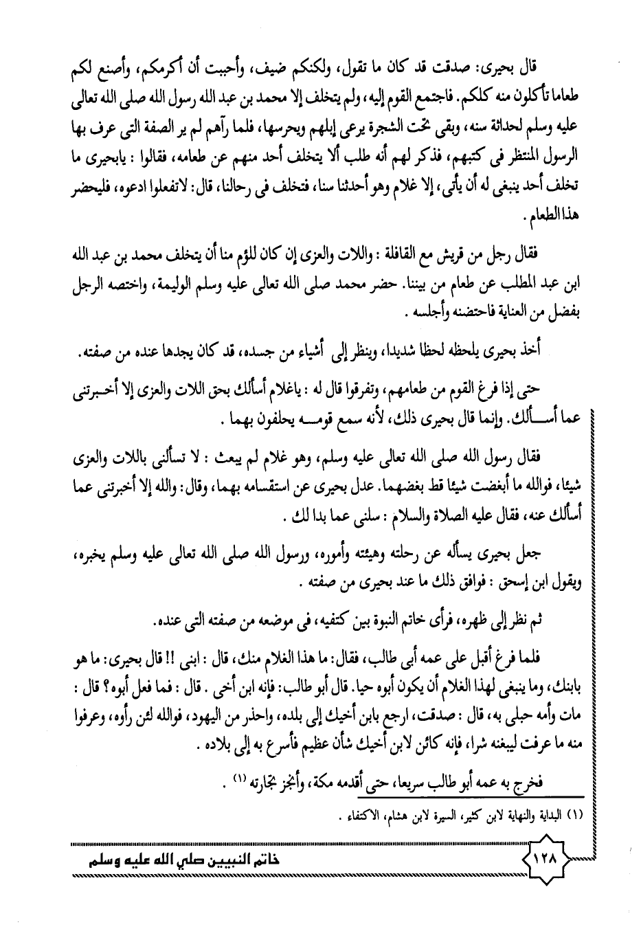 فلما فرغ أقبل على عمه أبى طالب، فقال: ما هذا الغلام منك، قال: ابنى!! قال بحيرى: ما هو بابنك، وما ينبغى لهذا الغلام أن يكون أبوه حيا. قال أبو طالب: فإنه ابن أخى. قال: فما فعل أبوه؟ قال: