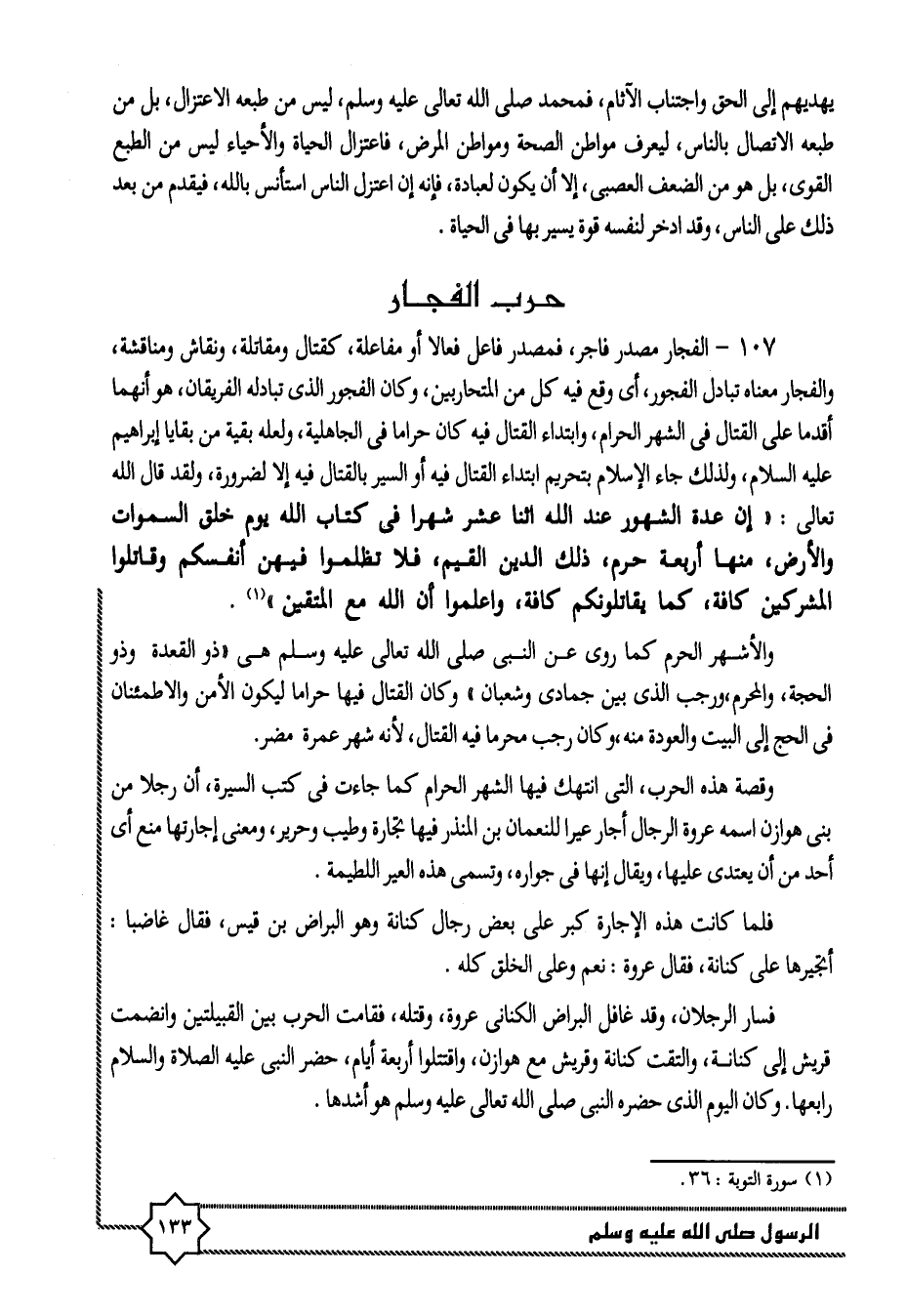 107- الفجار مصدر فاجر، فمصدر فاعل فعالا أو مفاعلة، كقتال ومقاتلة، ونقاش ومناقشة، والفجار معناه تبادل الفجور، أى وقع فيه كل من المتحاربين، وكان الفجور الذى تبادله الفريقان، هو أنهما أقدما على القتال فى الشهر الحرام، وابتداء القتال فيه كان حراما فى الجاهلية، ولعله بقية من بقايا إبراهيم عليه السلام، ولذلك جاء الإسلام بتحريم ابتداء القتال فيه أو السير بالقتال فيه إلا لضرورة، ولقد قال الله تعالى: «إن عدة الشهور عند الله اثنا عشر شهرا فى كتاب الله يوم خلق السموات والأرض، منها أربعة حرم، ذلك الدين القيم، فلا تظلموا فيهن أنفسكم وقاتلوا المشركين كافة، كما يقاتلونكم كافة، واعلموا أن الله مع المتقين» «1» .