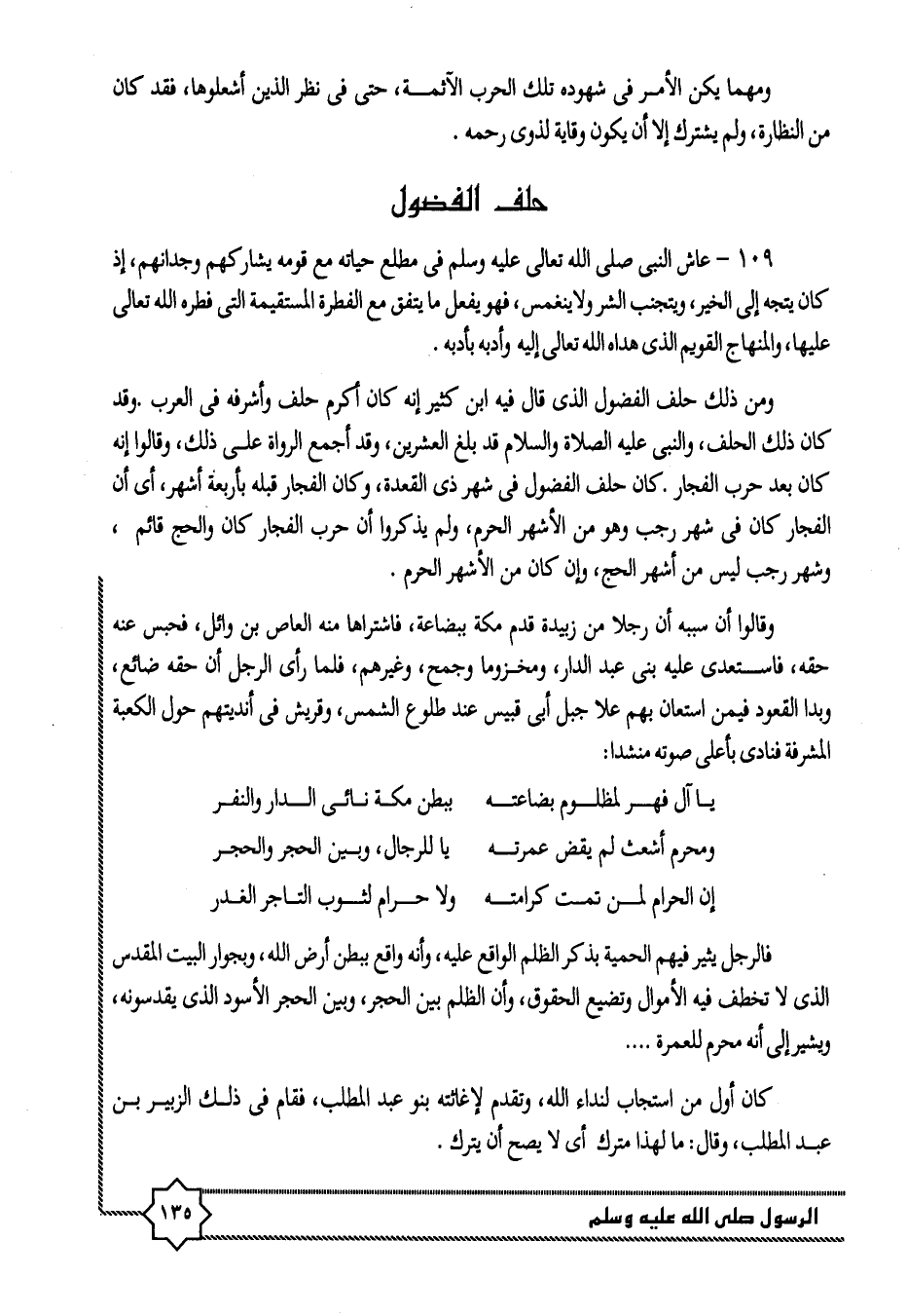 ومن ذلك حلف الفضول الذى قال فيه ابن كثير إنه كان أكرم حلف وأشرفه فى العرب وقد كان ذلك الحلف، والنبى عليه الصلاة والسلام قد بلغ العشرين، وقد أجمع الرواة على ذلك، وقالوا إنه كان بعد حرب الفجار. كان حلف الفضول فى شهر ذى القعدة، وكان الفجار قبله بأربعة أشهر، أى أن الفجار كان فى شهر رجب وهو من الأشهر الحرم، ولم يذكروا أن حرب الفجار كان والحج قائم، وشهر رجب ليس من أشهر الحج، وإن كان من الأشهر الحرم.