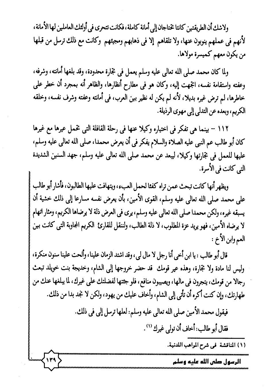 112- بينما هى تفكر فى اختياره وكيلا عنها فى رحلة القافلة التى تحمل عيرها مع غيرها كان أبو طالب عم النبى عليه الصلاة والسلام يفكر فى أن يعرض محمدا، صلى الله تعالى عليه وسلم، عليها للعمل فى تجارتها وكيلا، ليبعد عن محمد صلى الله تعالى عليه وسلم، جهد السنين الشديدة التى كانت فى الأسرة.