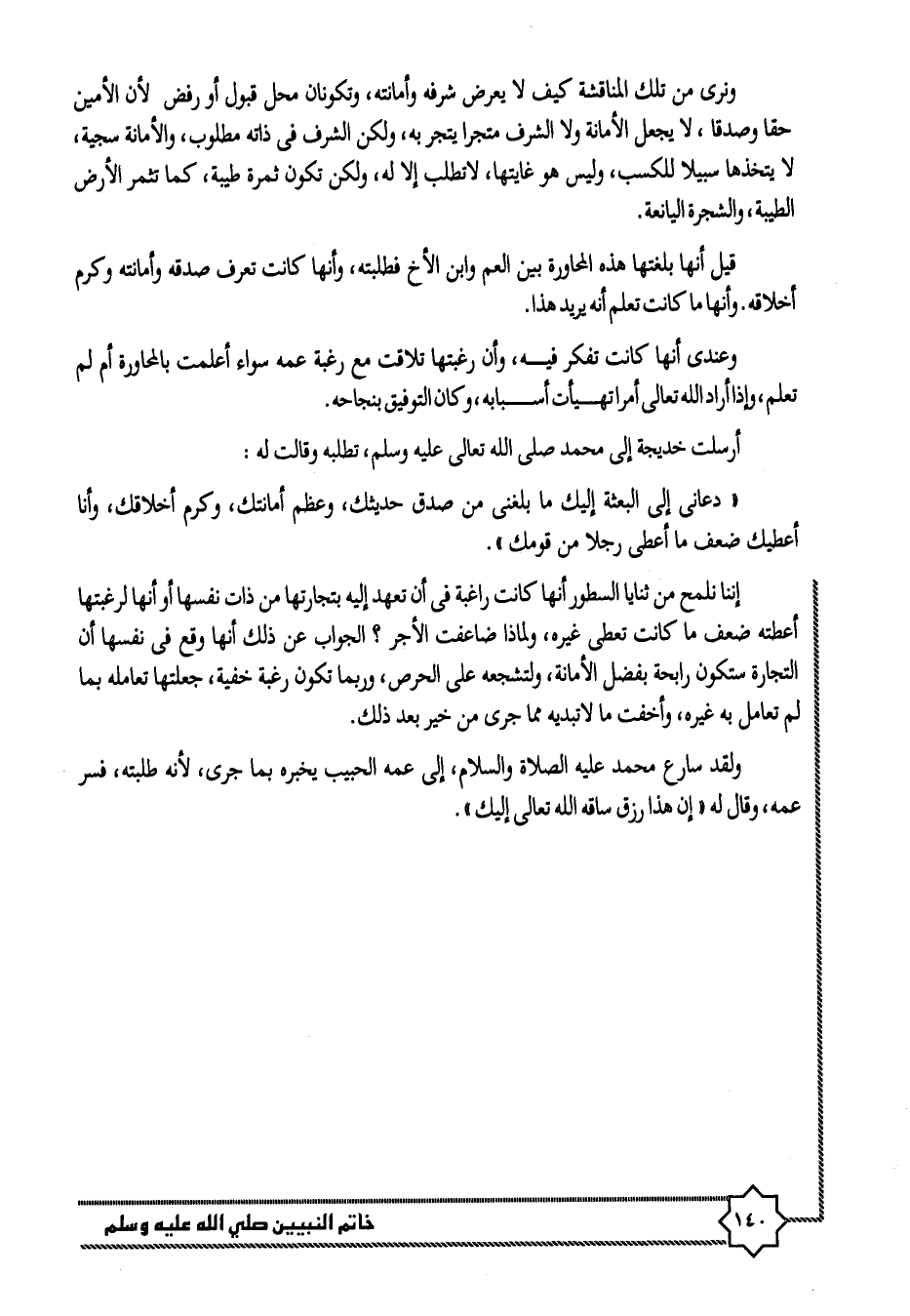 إننا نلمح من ثنايا السطور أنها كانت راغبة فى أن تعهد إليه بتجارتها من ذات نفسها أو أنها لرغبتها أعطته ضعف ما كانت تعطى غيره، ولماذا ضاعفت الأجر؟ الجواب عن ذلك أنها وقع فى نفسها أن التجارة ستكون رابحة بفضل الأمانة، ولتشجعه على الحرص، وربما تكون رغبة خفية، جعلتها تعامله بما لم تعامل به غيره، وأخفت ما لا تبديه مما جرى من خير بعد ذلك.