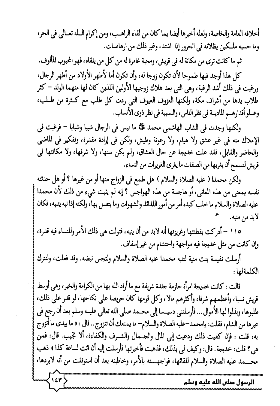 ولكنها وجدت فى الشاب الهاشمى محمد صلّى الله عليه وسلّم ما ليس فى الرجال شيبا وشبابا- فرغبت فى الإملاك منه فى غير عشق ولا هيام، ولا رعونة وطيش، ولكن فى إرادة مقدرة، وتفكير فى الماضى والحاضر والقابل، فقد علت خديجة عن حال العشاق، ولم يكن سنها، ولا شرفها، ولا مكانتها فى قريش لتسمح أن يغريها من الصفات ما يغرى الغريرات من النساء.