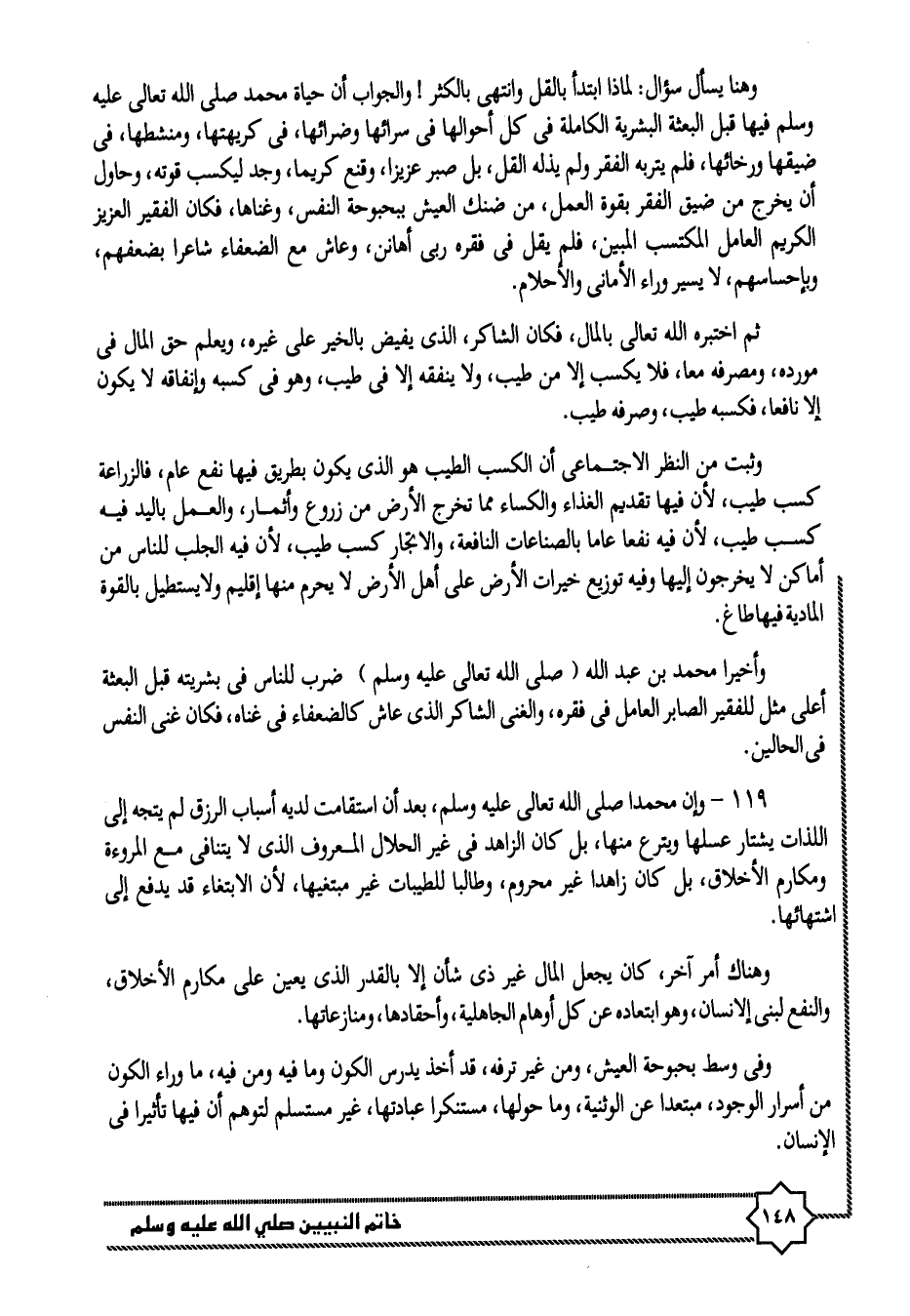 وأخيرا محمد بن عبد الله (صلى الله تعالى عليه وسلم) ضرب للناس فى بشريته قبل البعثة أعلى مثل للفقير الصابر العامل فى فقره، والغنى الشاكر الذى عاش كالضعفاء فى غناه، فكان غنى النفس فى الحالين.