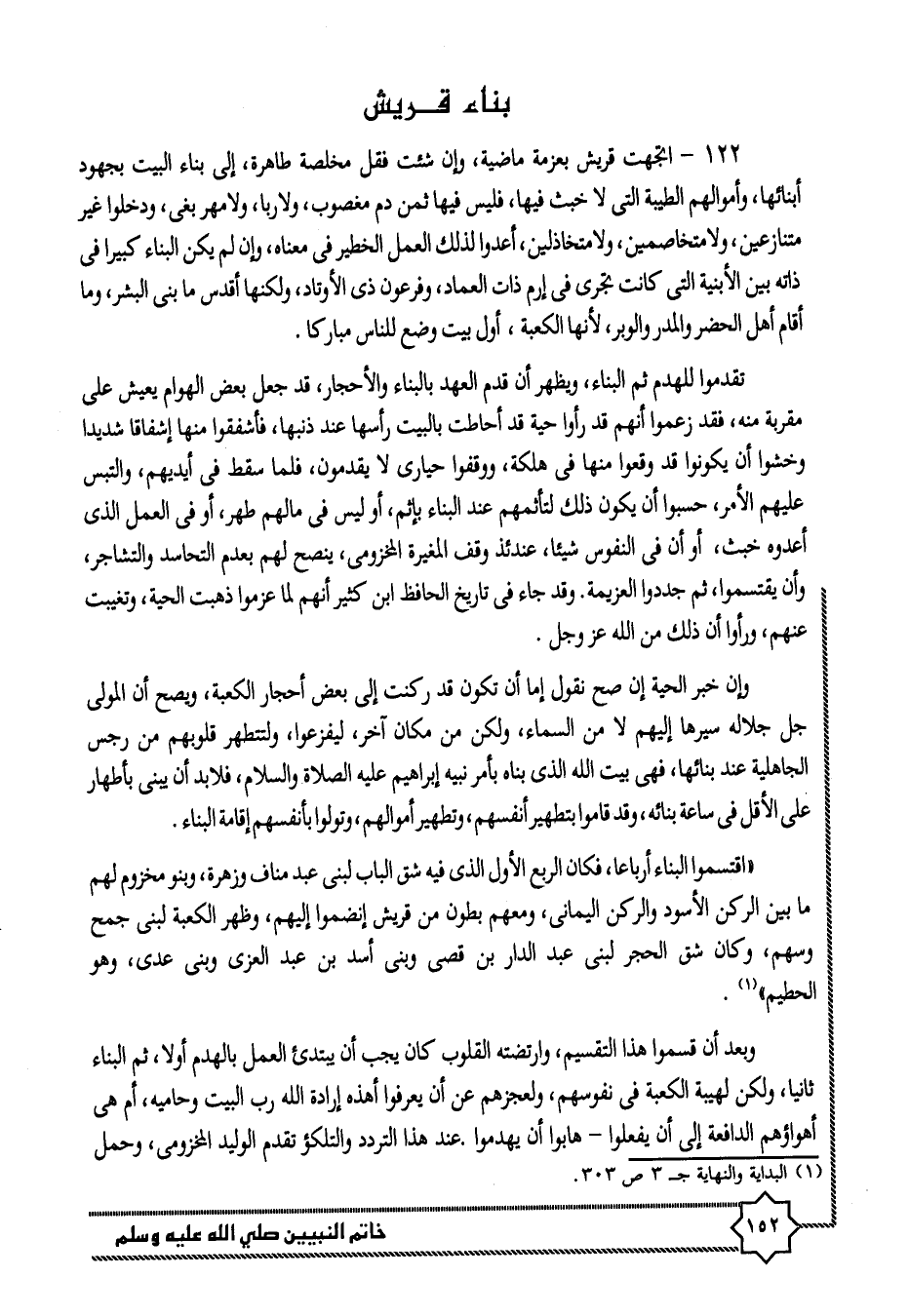 122- اتجهت قريش بعزمة ماضية، وإن شئت فقل مخلصة طاهرة، إلى بناء البيت بجهود أبنائها، وأموالهم الطيبة التى لا خبث فيها، فليس فيها ثمن دم مغصوب، ولا ربا، ولا مهر بغى، ودخلوا غير متنازعين، ولا متخاصمين، ولا متخاذلين، أعدوا لذلك العمل الخطير فى معناه، وإن لم يكن البناء كبيرا فى ذاته بين الأبنية التى كانت تجرى فى إرم ذات العماد، وفرعون ذى الأوتاد، ولكنها أقدس ما بنى البشر، وما أقام أهل الحضر والمدر والوبر، لأنها الكعبة، أول بيت وضع للناس مباركا.