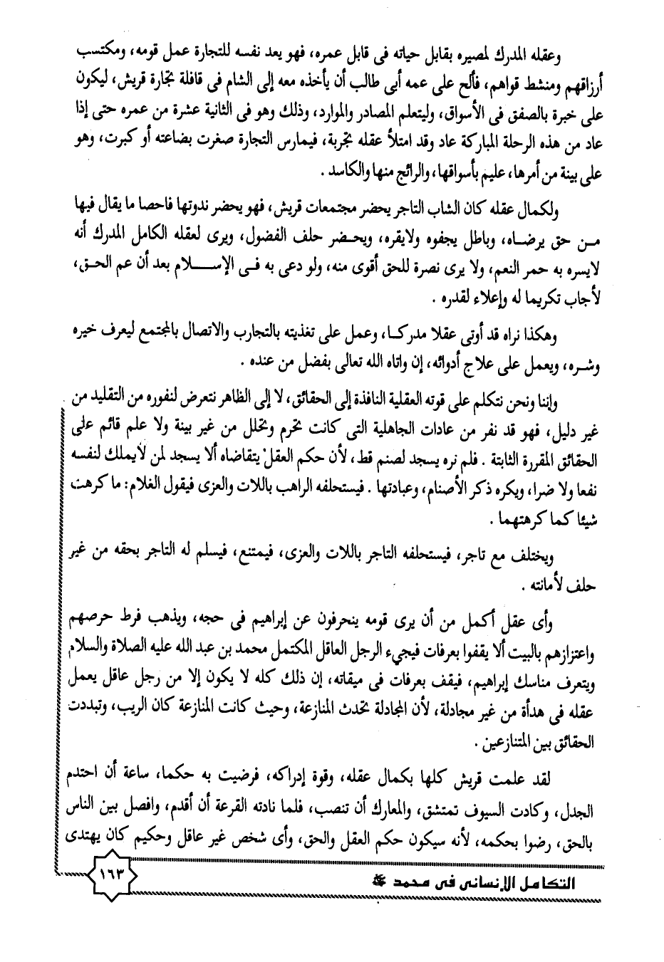 وأى عقل أكمل من أن يرى قومه ينحرفون عن إبراهيم فى حجه، ويذهب فرط حرصهم واعتزازهم بالبيت ألا يقفوا بعرفات فيجيء الرجل العاقل المكتمل محمد بن عبد الله عليه الصلاة والسلام ويتعرف مناسك إبراهيم، فيقف بعرفات فى ميقاته، إن ذلك كله لا يكون إلا من رجل عاقل يعمل عقله فى هدأة من غير مجادلة، لأن المجادلة تحدث المنازعة، وحيث كانت المنازعة كان الريب، وتبددت الحقائق بين المتنازعين.