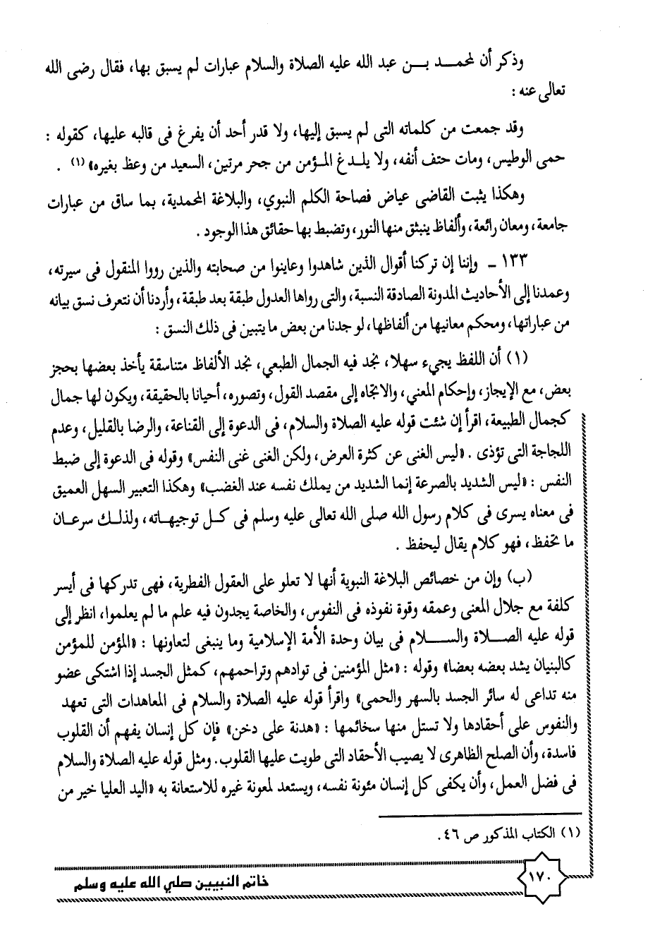 133- وإننا إن تركنا أقوال الذين شاهدوا وعاينوا من صحابته والذين رووا المنقول فى سيرته، وعمدنا إلى الأحاديث المدونة الصادقة النسبة، والتى رواها العدول طبقة بعد طبقة، وأردنا أن نتعرف نسق بيانه من عباراتها، ومحكم معانيها من ألفاظها، لو جدنا من بعض ما يتبين فى ذلك النسق: