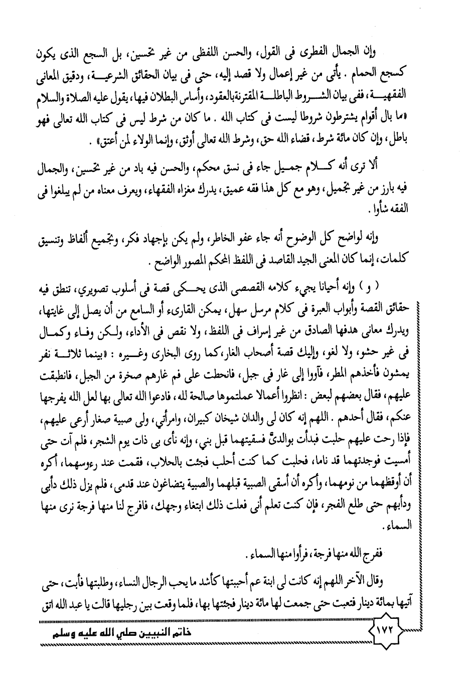 (و) وإنه أحيانا يجيء كلامه القصصى الذى يحكى قصة فى أسلوب تصويري، تنطق فيه حقائق القصة وأبواب العبرة فى كلام مرسل سهل، يمكن القارىء أو السامع من أن يصل إلى غايتها، ويدرك معانى هدفها الصادق من غير إسراف فى اللفظ، ولا نقص فى الأداء، ولكن وفاء وكمال فى غير حشو، ولا لغو، وإليك قصة أصحاب الغار، كما روى البخارى وغيره: «بينما ثلاثة نفر يمشون فأخذهم المطر، فاووا إلى غار فى جبل، فانحطت على فم غارهم صخرة من الجبل، فانطبقت عليهم، فقال بعضهم لبعض: انظروا أعمالا عملتموها صالحة لله، فادعوا الله تعالى بها لعل الله يفرجها عنكم، فقال أحدهم. اللهم إنه كان لى والدان شيخان كبيران، وامرأتي، ولى صبية صغار أرعى عليهم، فإذا رحت عليهم حلبت فبدأت بوالدىّ فسقيتهما قبل بني، وإنه نأى بى ذات يوم الشجر، فلم ات حتى أمسيت فوجدتهما قد ناما، فحلبت كما كنت أحلب فجئت بالحلاب، فقمت عند رؤسهما، أكره أن أوقظهما من نومهما، وأكره أن أسقى الصبية قبلهما والصبية يتضاغون عند قدمى، فلم يزل ذلك دأبى ودأبهم حتى طلع الفجر، فإن كنت تعلم أنى فعلت ذلك ابتغاء وجهك، فافرج لنا منها فرجة نرى منها السماء.
