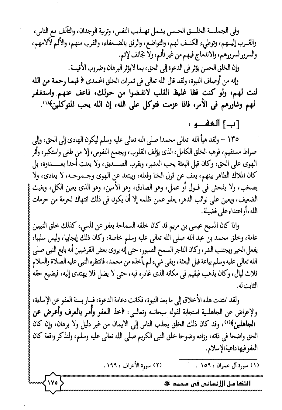 135- ولقد هيأ الله تعالى محمدا صلى الله تعالى عليه وسلم ليكون الهادى إلى الحق، وإلى صراط مستقيم، فوهبه الخلق الكامل، الذى يؤلف القلوب، ويجمع النفوس، إلا من طغى واستكبر، واثر الهوى على الحق، وكان قبل البعثة يحب العشير، ويقرب الصديق، ولا يعنت أحدا بعداوة، بل كان الملاك الطاهر بينهم، يعف عن قول الخنا وفعله، ويبتعد عن الهوى وجموحه، لا يعادى، ولا يصخب، ولا يفحش فى قول أو عمل، وهو الصادق، وهو الأمين، وهو الذى يعين الكل، ويغيث الضعيف، ويعين على نوائب الدهر، يعفو عمن ظلمه إلا أن يكون فى ذلك انتهاك لحرمة من حرمات الله، أو اعتداء على فضيلة.