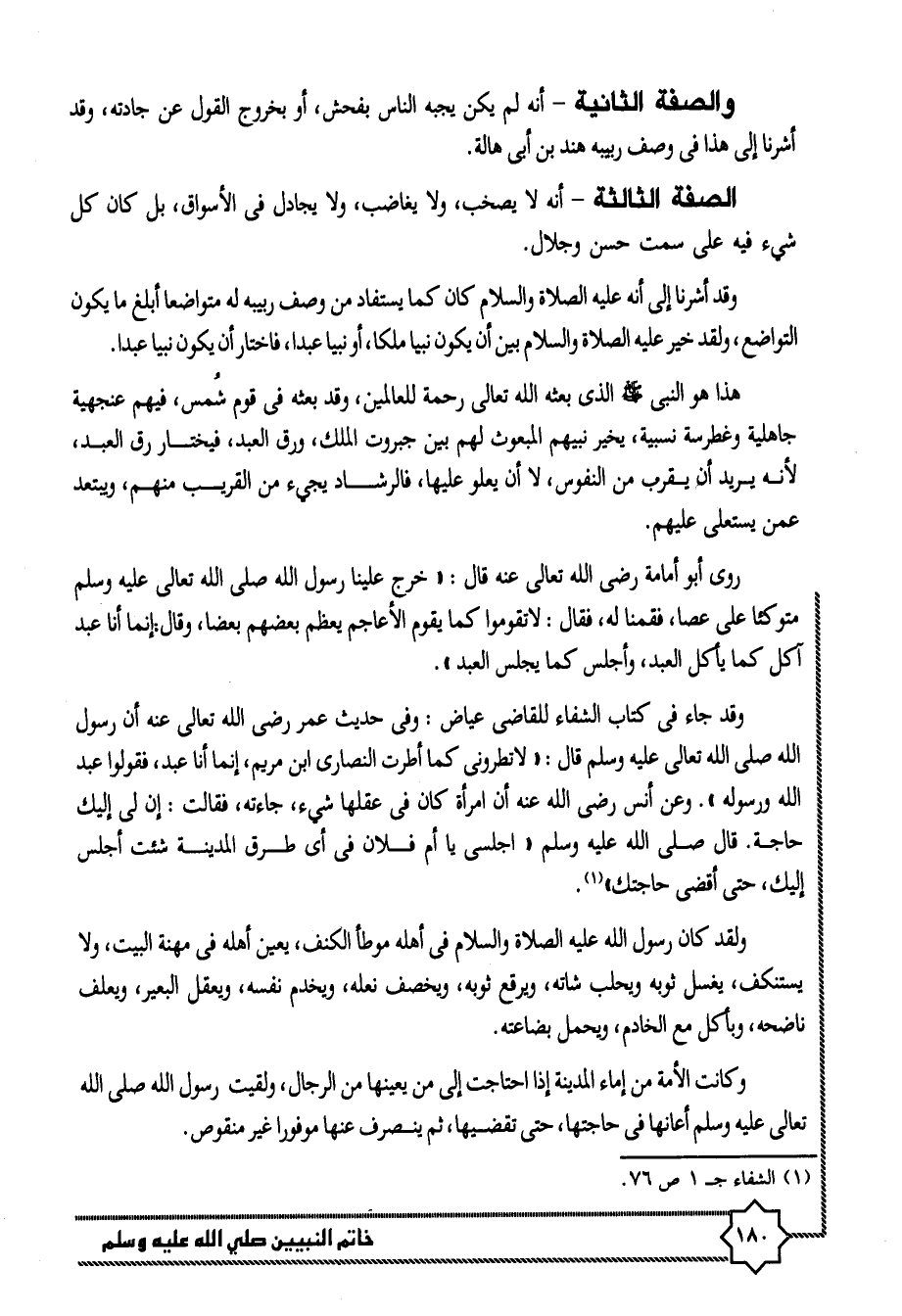 وقد جاء فى كتاب الشفاء للقاضى عياض: وفى حديث عمر رضى الله تعالى عنه أن رسول الله صلى الله تعالى عليه وسلم قال: «لا تطرونى كما أطرت النصارى ابن مريم، إنما أنا عبد، فقولوا عبد الله ورسوله» . وعن أنس رضى الله عنه أن امرأة كان فى عقلها شيء، جاءته، فقالت: إن لى إليك حاجة. قال صلى الله عليه وسلم «اجلسى يا أم فلان فى أى طرق المدينة شئت أجلس إليك، حتى أقضى حاجتك» «1» .