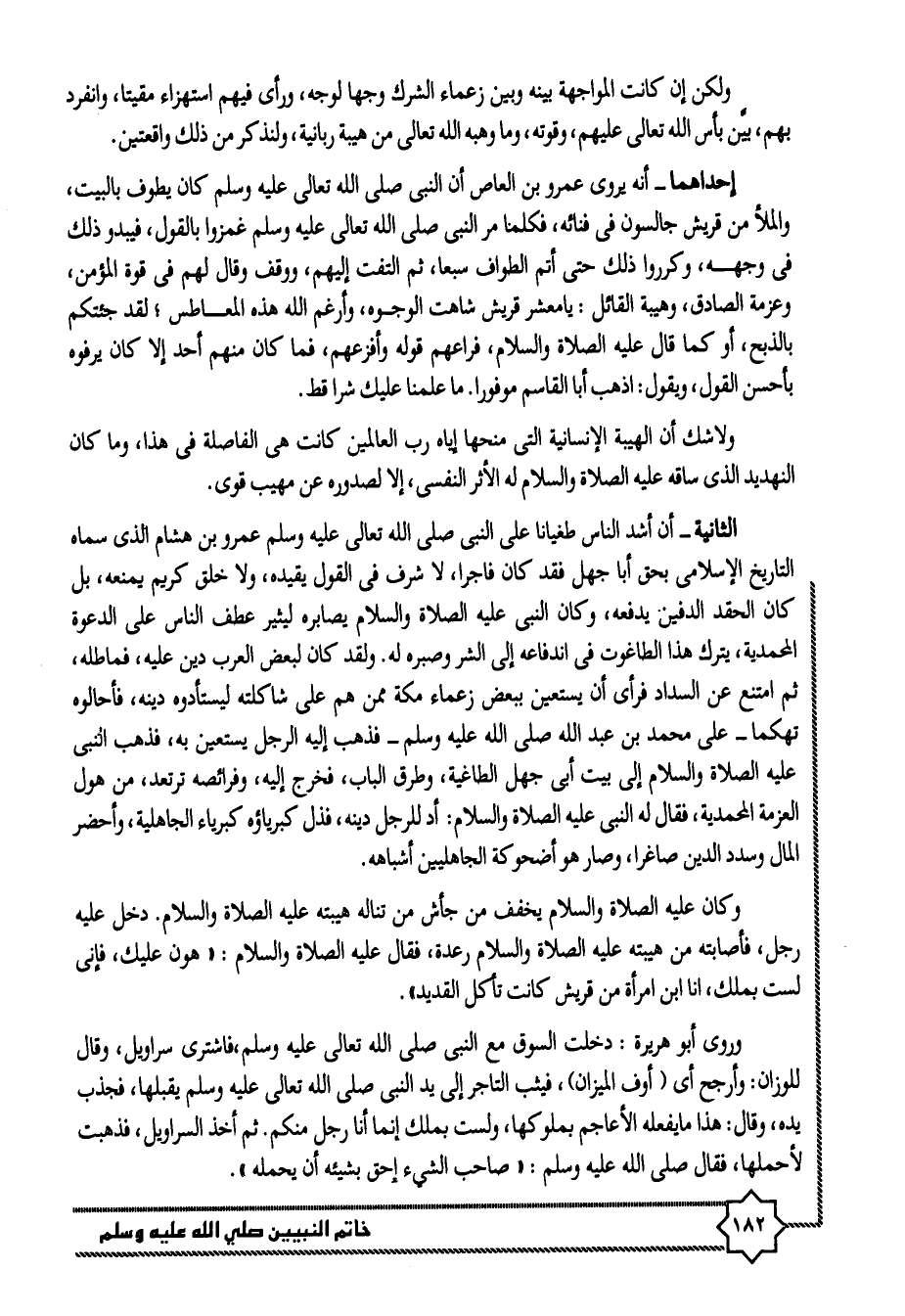 وروى أبو هريرة: دخلت السوق مع النبى صلى الله تعالى عليه وسلم، فاشترى سراويل، وقال للوزان: وأرجح أى (أوف الميزان) ، فيثب التاجر إلى يد النبى صلى الله تعالى عليه وسلم يقبلها، فجذب يده، وقال: هذا ما يفعله الأعاجم بملوكها، ولست بملك إنما أنا رجل منكم. ثم أخذ السراويل، فذهبت لأحملها، فقال صلى الله عليه وسلم: «صاحب الشيء إحق بشيئه أن يحمله» .