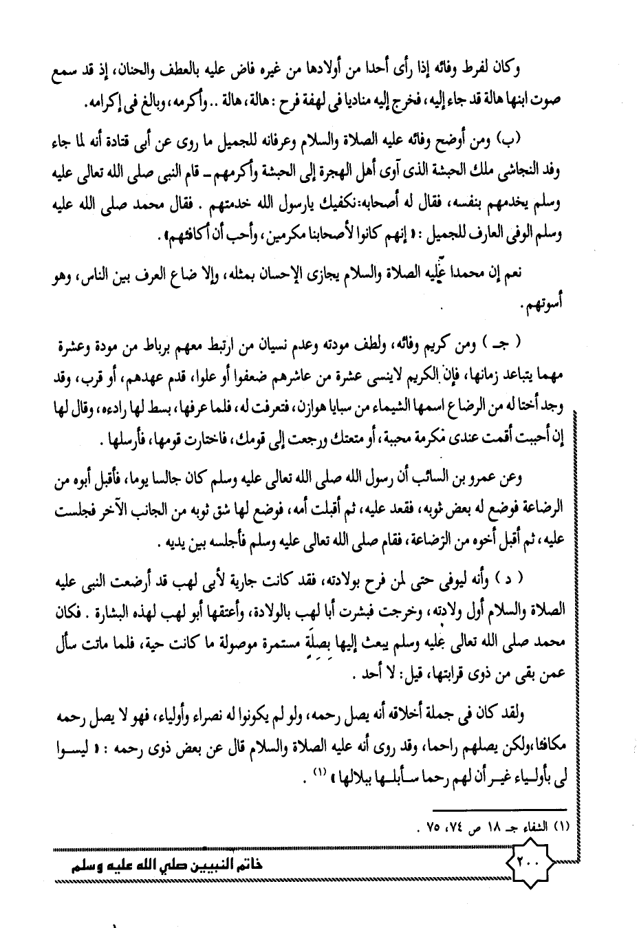 (د) وأنه ليوفى حتى لمن فرح بولادته، فقد كانت جارية لأبى لهب قد أرضعت النبى عليه الصلاة والسلام أول ولادته، وخرجت فبشرت أبا لهب بالولادة، وأعتقها أبو لهب لهذه البشارة. فكان محمد صلى الله تعالى عليه وسلم يبعث إليها بصلة مستمرة موصولة ما كانت حية، فلما ماتت سأل عمن بقى من ذوى قرابتها، قيل: لا أحد.