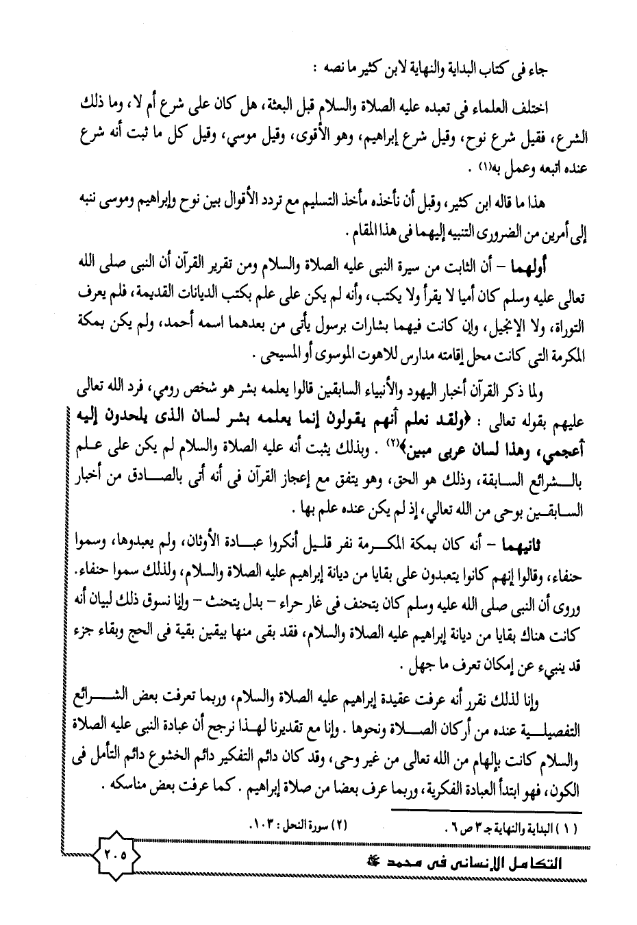 وإنا لذلك نقرر أنه عرفت عقيدة إبراهيم عليه الصلاة والسلام، وربما تعرفت بعض الشرائع التفصيلية عنده من أركان الصلاة ونحوها. وإنا مع تقديرنا لهذا نرجح أن عبادة النبى عليه الصلاة والسلام كانت بإلهام من الله تعالى من غير وحى، وقد كان دائم التفكير دائم الخشوع دائم التأمل فى الكون، فهو ابتدأ العبادة الفكرية، وربما عرف بعضا من صلاة إبراهيم. كما عرفت بعض مناسكه.
