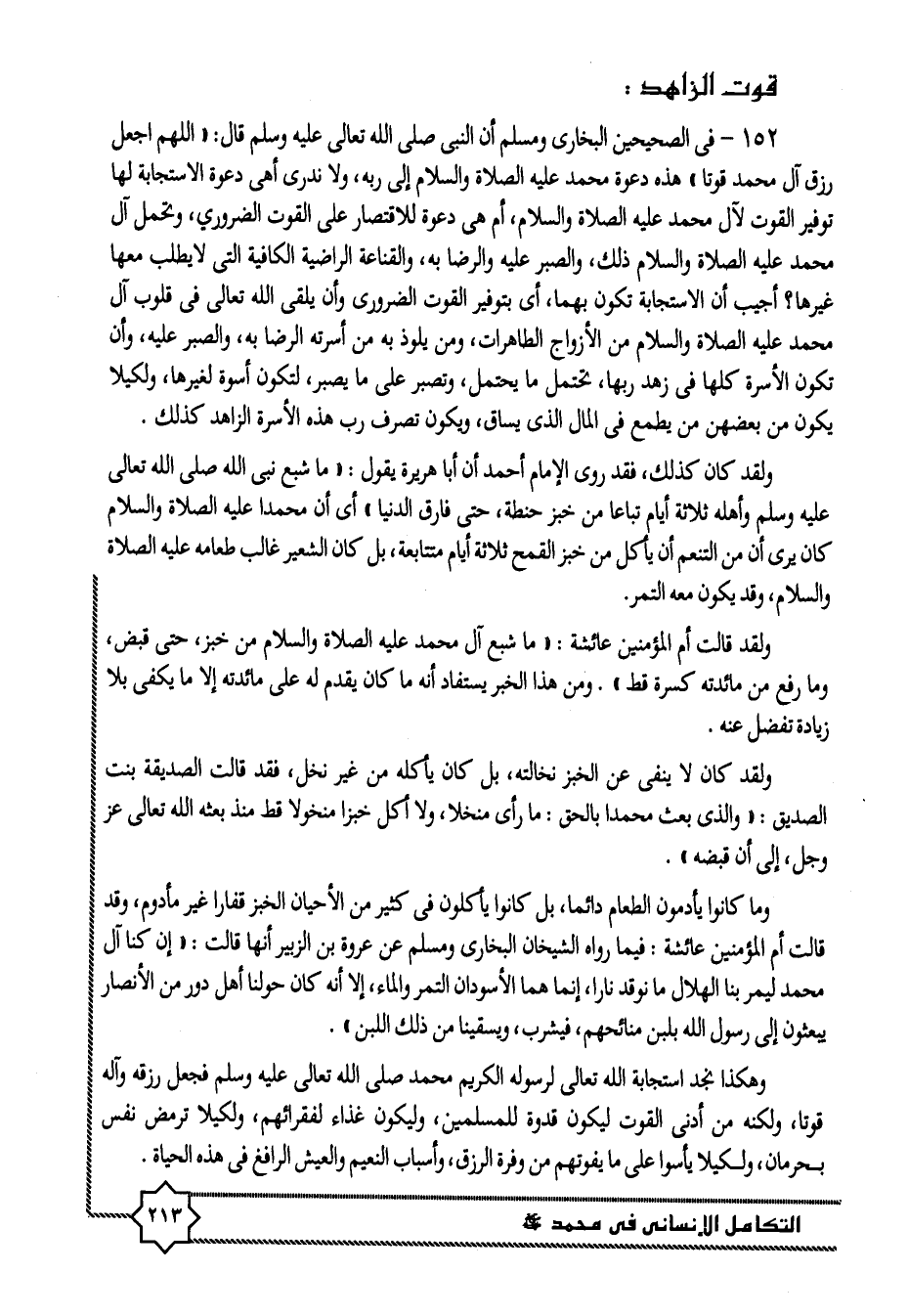 152- فى الصحيحين البخارى ومسلم أن النبى صلى الله تعالى عليه وسلم قال: «اللهم اجعل رزق ال محمد قوتا» هذه دعوة محمد عليه الصلاة والسلام إلى ربه، ولا ندرى أهى دعوة الاستجابة لها توفير القوت لال محمد عليه الصلاة والسلام، أم هى دعوة للاقتصار على القوت الضروري، وتحمل ال محمد عليه الصلاة والسلام ذلك، والصبر عليه والرضا به، والقناعة الراضية الكافية التى لا يطلب معها غيرها؟ أجيب أن الاستجابة تكون بهما، أى بتوفير القوت الضرورى وأن يلقى الله تعالى فى قلوب ال محمد عليه الصلاة والسلام من الأزواج الطاهرات، ومن يلوذ به من أسرته الرضا به، والصبر عليه، وأن تكون الأسرة كلها فى زهد ربها، تحتمل ما يحتمل، وتصبر على ما يصبر، لتكون أسوة لغيرها، ولكيلا يكون من بعضهن من يطمع فى المال الذى يساق، ويكون تصرف رب هذه الأسرة الزاهد كذلك.