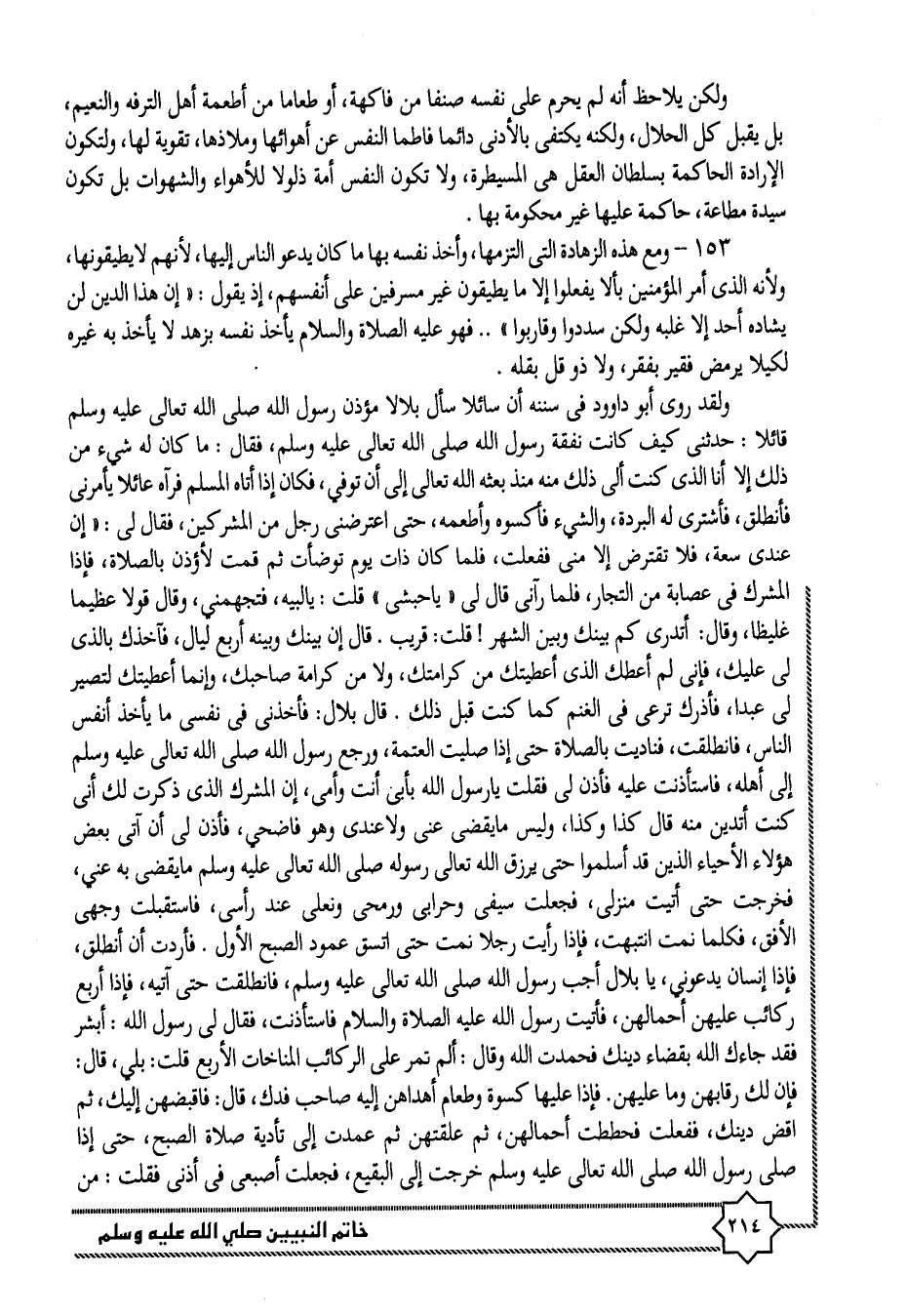 ولقد روى أبو داود فى سننه أن سائلا سأل بلالا مؤذن رسول الله صلى الله تعالى عليه وسلم قائلا: حدثنى كيف كانت نفقة رسول الله صلى الله تعالى عليه وسلم، فقال: ما كان له شيء من ذلك إلا أنا الذى كنت ألى ذلك منه منذ بعثه الله تعالى إلى أن توفي، فكان إذا أتاه المسلم فراه عائلا يأمرنى فأنطلق، فأشترى له البردة، والشيء فأكسوه وأطعمه، حتى اعترضنى رجل من المشركين، فقال لى: «إن عندى سعة، فلا تقترض إلا منى ففعلت، فلما كان ذات يوم توضأت ثم قمت لأؤذن بالصلاة، فإذا المشرك فى عصابة من التجار، فلما رانى قال لى «يا حبشى» قلت: يا لبيه، فتجهمني، وقال قولا عظيما غليظا، وقال: أتدرى كم بينك وبين الشهر! قلت: قريب. قال إن بينك وبينه أربع ليال، فاخذك بالذى لى عليك، فإنى لم أعطك الذى أعطيتك من كرامتك، ولا من كرامة صاحبك، وإنما أعطيتك لتصير لى عبدا، فأذرك ترعى فى الغنم كما كنت قبل ذلك. قال بلال: فأخذنى فى نفسى ما يأخذ أنفس الناس، فانطلقت، فناديت بالصلاة حتى إذا صليت العتمة، ورجع رسول الله صلى الله تعالى عليه وسلم إلى أهله، فاستأذنت عليه فأذن لى فقلت يا رسول الله بأبى أنت وأمى، إن المشرك الذى ذكرت لك أنى كنت أتدين منه قال كذا وكذا، وليس ما يقضى عنى ولا عندى وهو فاضحي، فأذن لى أن اتى بعض هؤلاء الأحياء الذين قد أسلموا حتى يرزق الله تعالى رسوله صلى الله تعالى عليه وسلم ما يقضى به عني، فخرجت حتى أتيت منزلى، فجعلت سيفى وحرابى ورمحى ونعلى عند رأسى، فاستقبلت وجهى الأفق، فكلما نمت انتبهت، فإذا رأيت رجلا نمت حتى اتسق عمود الصبح الأول. فأردت أن أنطلق، فإذا إنسان يدعوني، يا بلال أجب رسول الله صلى الله تعالى عليه وسلم، فانطلقت حتى اتيه، فإذا أربع ركائب عليهن أحمالهن، فأتيت رسول الله عليه الصلاة والسلام فاستأذنت، فقال لى رسول الله: أبشر فقد جاءك الله بقضاء دينك فحمدت الله وقال: ألم تمر على الركائب المناخات الأربع قلت: بلي، قال: