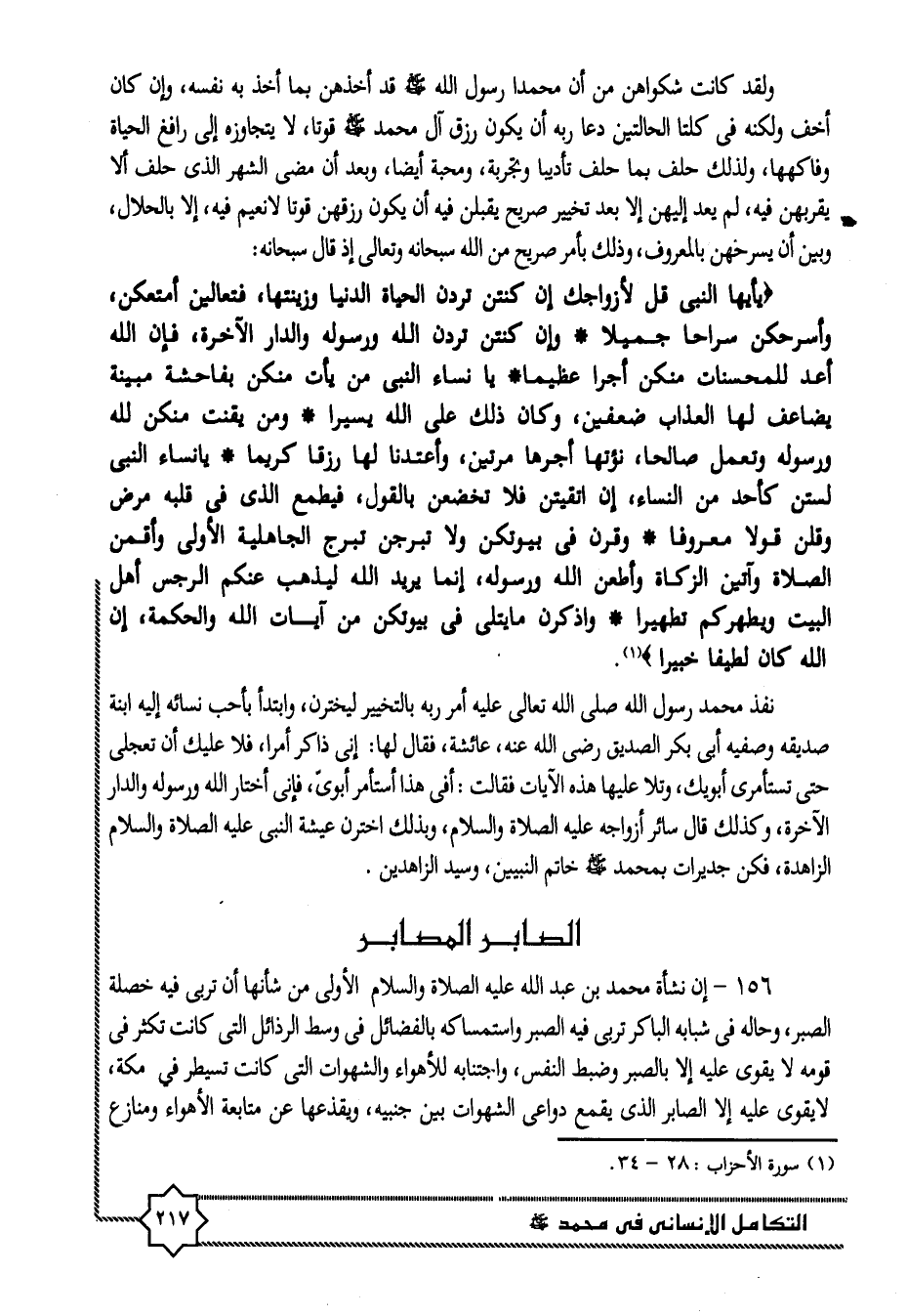 156- إن نشأة محمد بن عبد الله عليه الصلاة والسلام الأولى من شأنها أن تربى فيه خصلة الصبر، وحاله فى شبابه الباكر تربى فيه الصبر واستمساكه بالفضائل فى وسط الرذائل التى كانت تكثر فى قومه لا يقوى عليه إلا بالصبر وضبط النفس، واجتنابه للأهواء والشهوات التى كانت تسيطر في مكة، لا يقوى عليه إلا الصابر الذى يقمع دواعى الشهوات بين جنبيه، ويقذعها عن متابعة الأهواء ومنازع