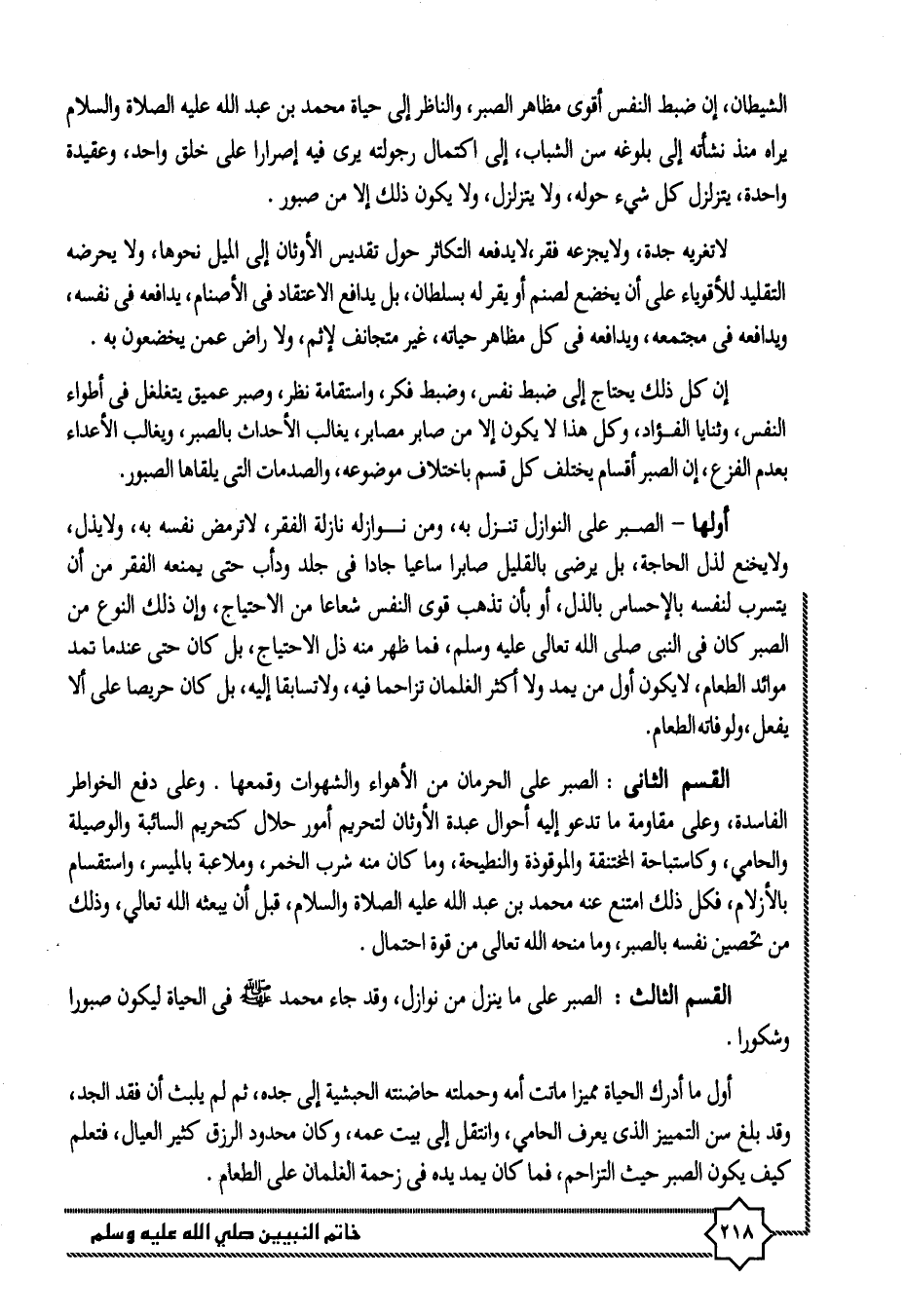 الشيطان، إن ضبط النفس أقوى مظاهر الصبر، والناظر إلى حياة محمد بن عبد الله عليه الصلاة والسلام يراه منذ نشأته إلى بلوغه سن الشباب، إلى اكتمال رجولته يرى فيه إصرارا على خلق واحد، وعقيدة واحدة، يتزلزل كل شيء حوله، ولا يتزلزل، ولا يكون ذلك إلا من صبور.