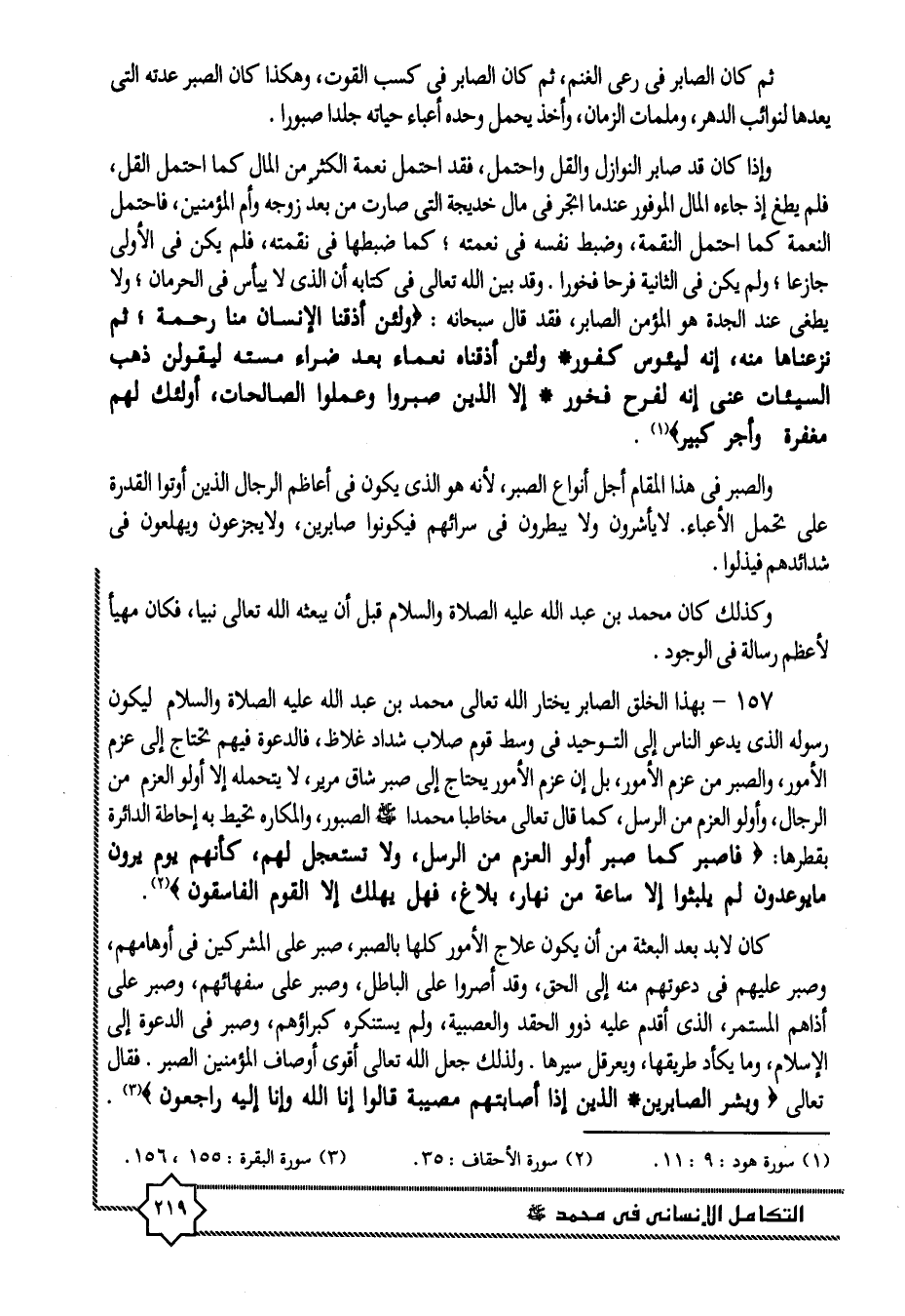 157- بهذا الخلق الصابر يختار الله تعالى محمد بن عبد الله عليه الصلاة والسلام ليكون رسوله الذى يدعو الناس إلى التوحيد فى وسط قوم صلاب شداد غلاظ، فالدعوة فيهم تحتاج إلى عزم الأمور، والصبر من عزم الأمور، بل إن عزم الأمور يحتاج إلى صبر شاق مرير، لا يتحمله إلا أولو العزم من الرجال، وأولو العزم من الرسل، كما قال تعالى مخاطبا محمدا صلّى الله عليه وسلّم الصبور، والمكاره تحيط به إحاطة الدائرة بقطرها: فَاصْبِرْ كَما صَبَرَ أُولُوا الْعَزْمِ مِنَ الرُّسُلِ، وَلا تَسْتَعْجِلْ لَهُمْ، كَأَنَّهُمْ يَوْمَ يَرَوْنَ ما يُوعَدُونَ لَمْ يَلْبَثُوا إِلَّا ساعَةً مِنْ نَهارٍ، بَلاغٌ، فَهَلْ يُهْلَكُ إِلَّا الْقَوْمُ الْفاسِقُونَ «2» .